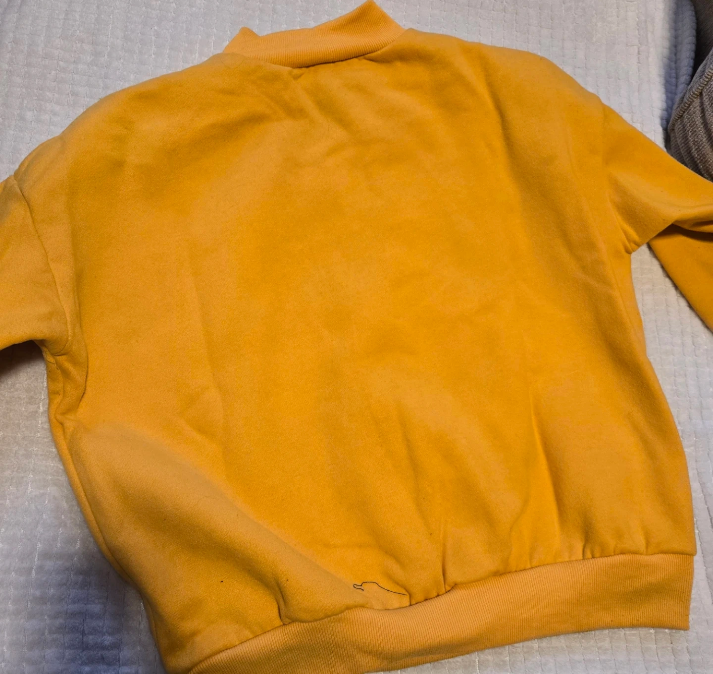 This yellow sweatshirt with cute duckies. It's a comfortable crewneck style with ribbed cuffs and hem. (Soft fabric, only worn once!)
