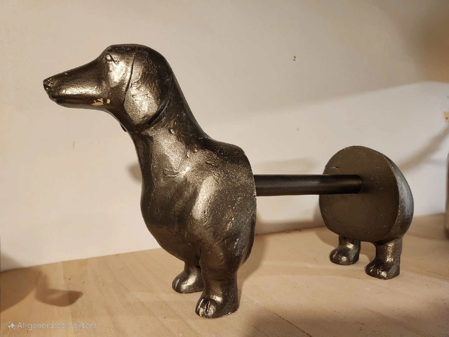 Here's a unique dachshund dog paper towel holder! It's a fun and quirky way to add some personality to your kitchen! It has a rustic, metallic finish that gives it a vintage look. There are some minor signs of wear, could use a quick touch-up, but it's still in good condition and ready to use