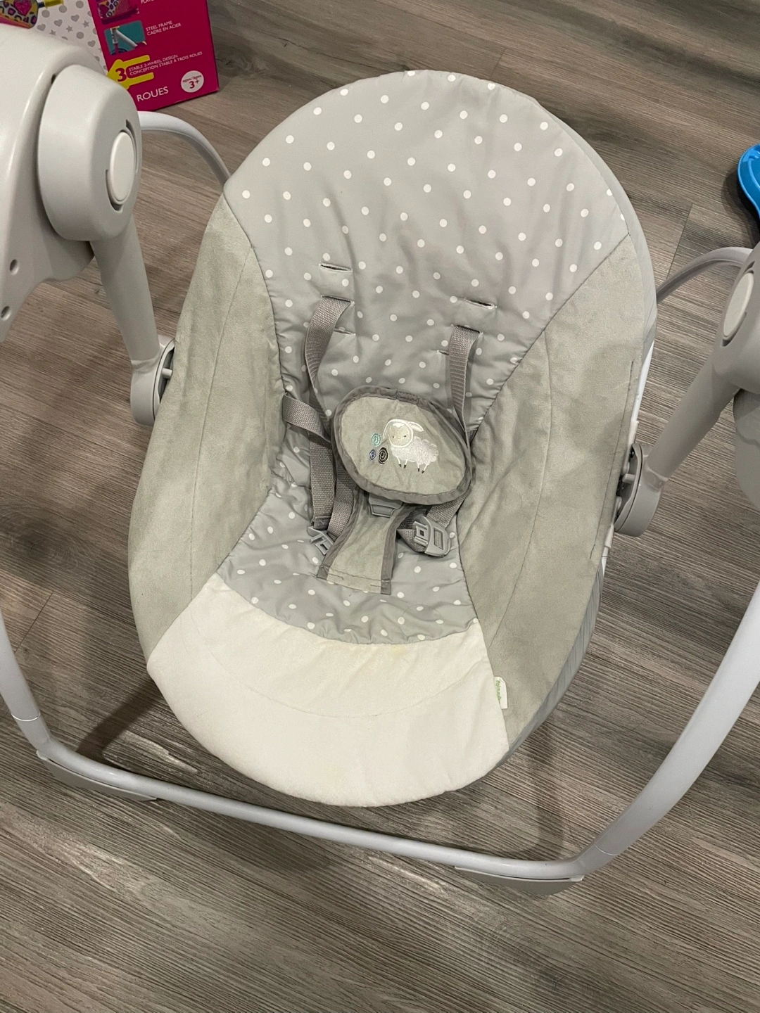 This Ingenuity baby swing features a grey and white polka dot pattern with a sheep accent. It's designed for infant comfort and portability. Includes multiple swing speeds and melodies.