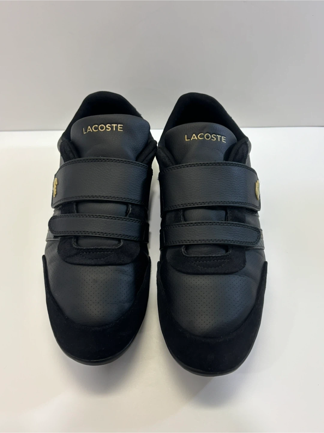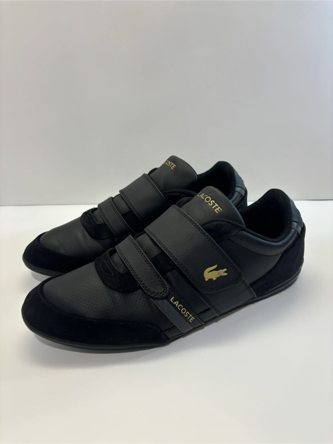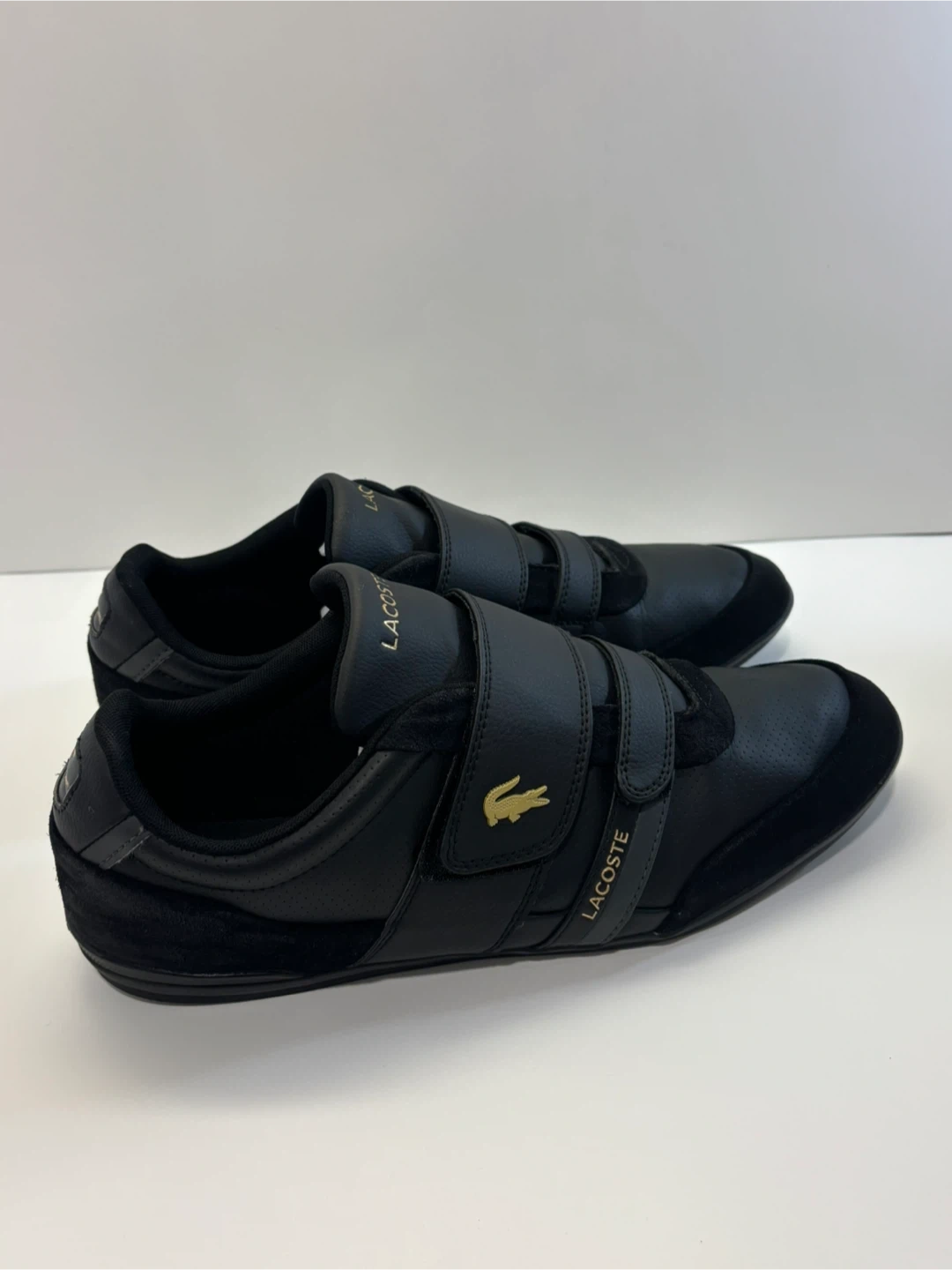 Lacoste Men's Misano Strap Sneaker men’s size 12 Retail $170+tax Clean and in like new condition ! Can also ship anywhere for $15 These are black Lacoste sneakers featuring a sleek design with velcro straps for easy on and off. They have the iconic Lacoste crocodile logo on the side and heel. The shoes are made of leather and suede. The Misano's simple silhouette is elevated for the new season with adaptable hook and loop strap fastenings. Soft suede uppers feature underlays crafted from net-inspired, perforated leather to inject sports heritage. An extra mesh hit below the strap adds technical flair. The distinctive gold crocodile sits on the strap and heel, drawing the eye and infusing an everyday style with effortless elegance.