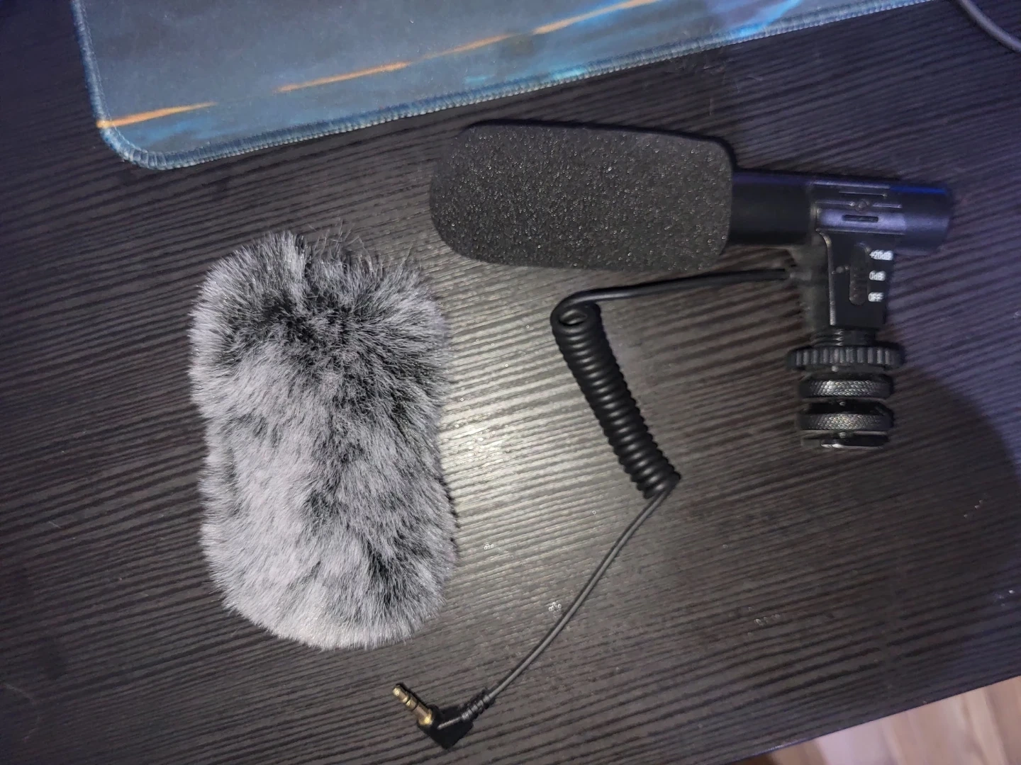 Complete shotgun microphone setup. Has the mic, a foam cover, and a furry wind muff for clear audio. Comes with a coiled cable that has a 3.5mm jack. Mic has switches for -20dB, 0dB, and OFF. Super handy for recording stuff.