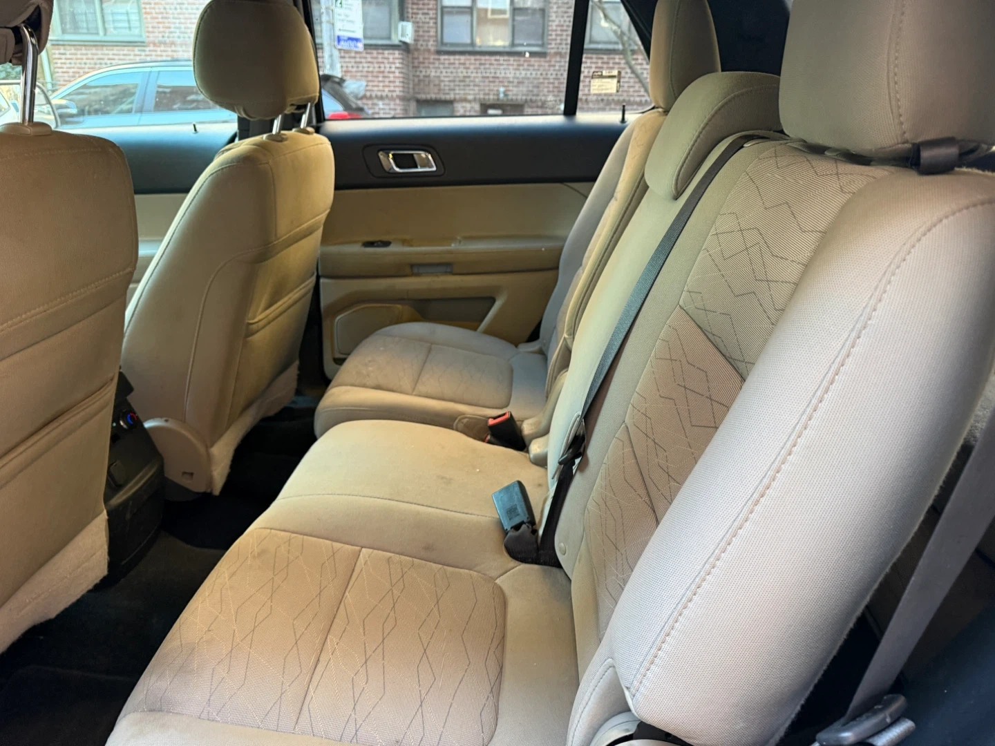 White Ford Explorer SUV with cloth interior. Comes with a leather-wrapped center console armrest. Perfect for families needing extra space.