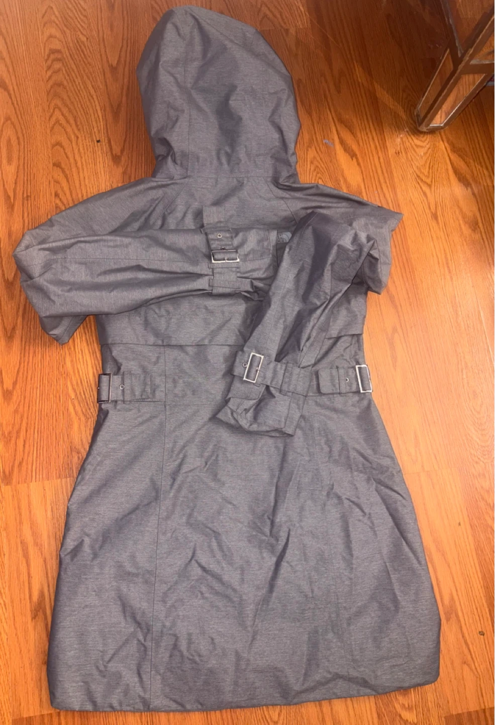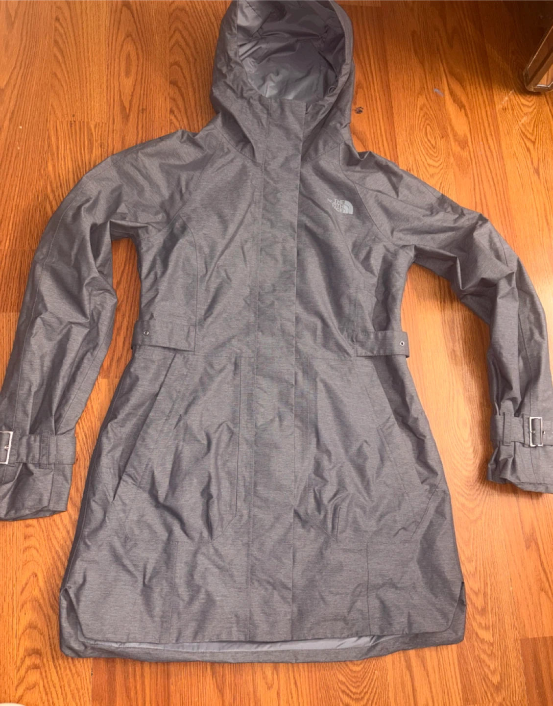 Selling a The North Face women's rain jacket in size XS. It is in good condition and perfect for rainy days. The jacket features a hood and a belted design. Size runs big