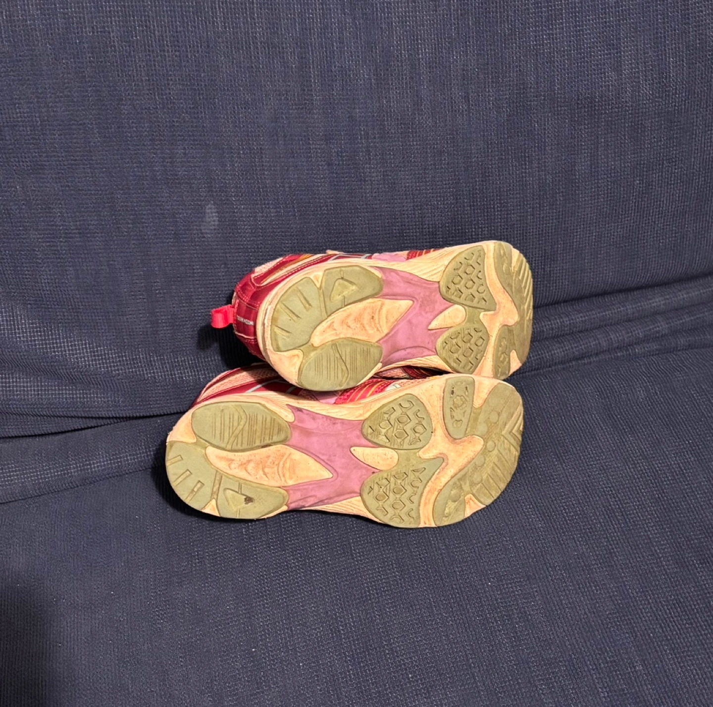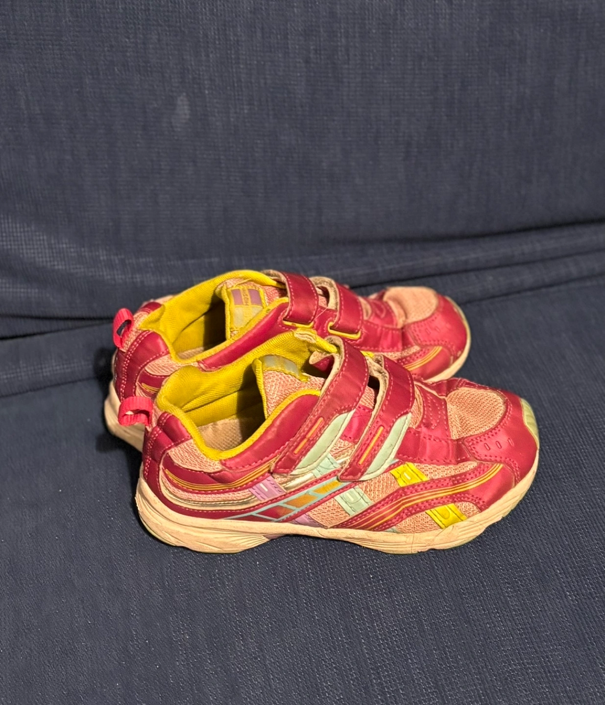 Pre-owned girls' running shoes. Pink and yellow colour scheme. Velcro closure. Good for active play.