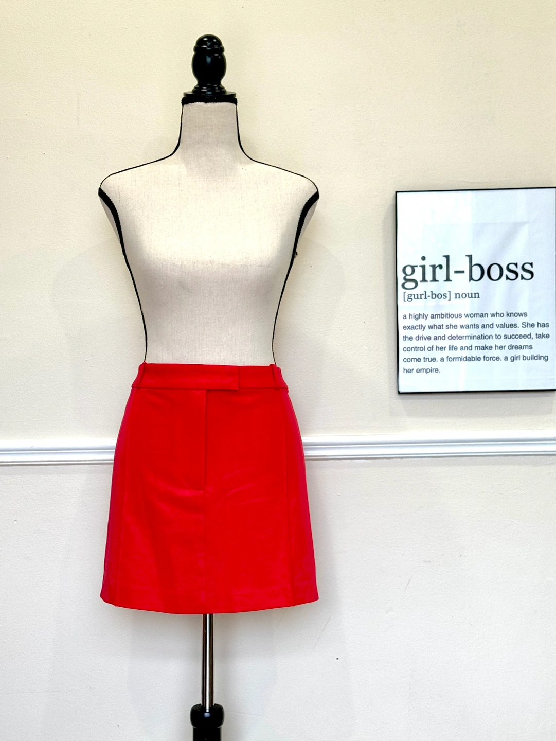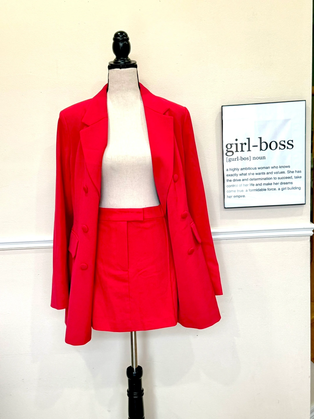 This is a bright red blazer and skirt set. The blazer is double-breasted and the skirt has a high waist.