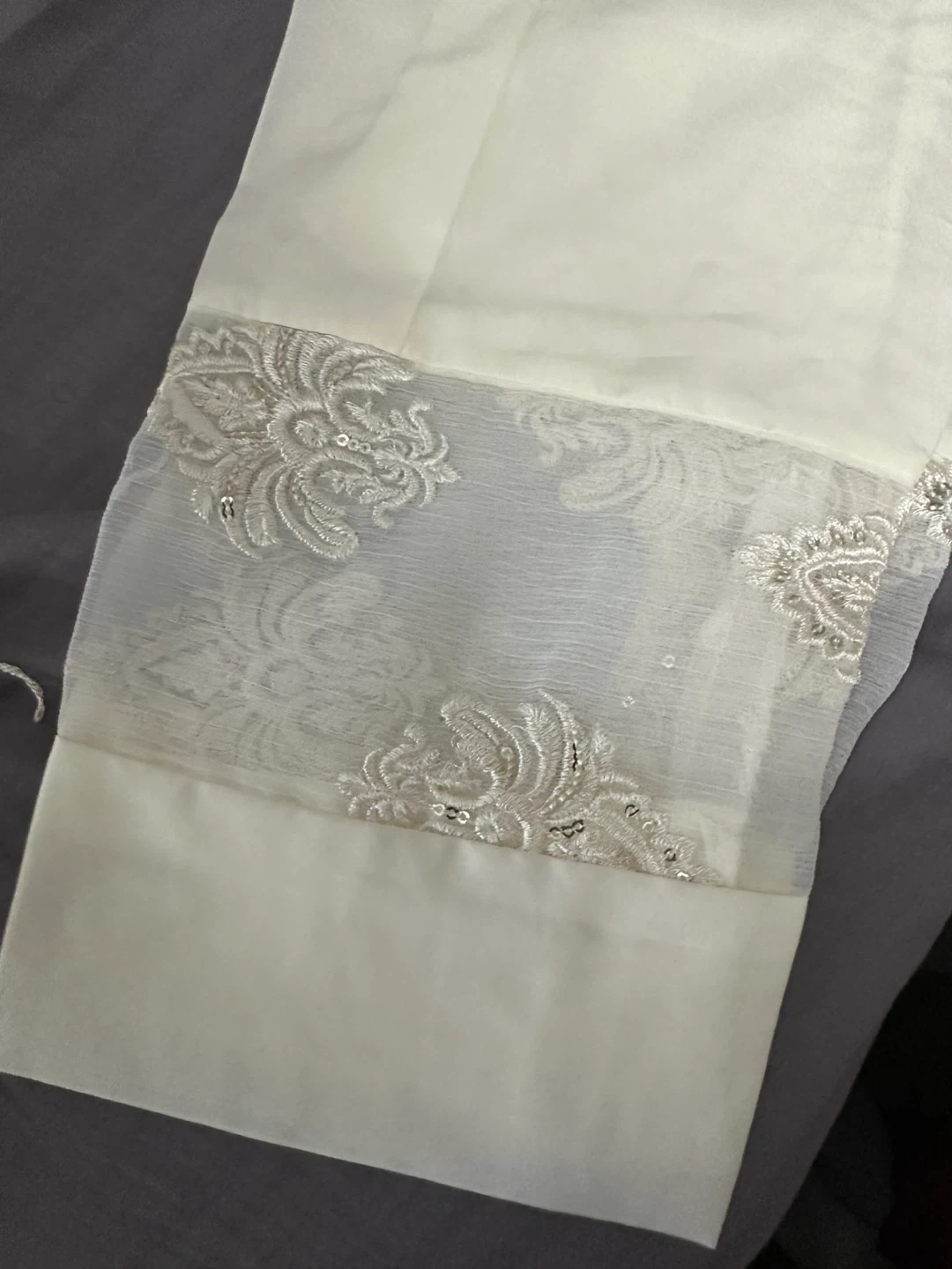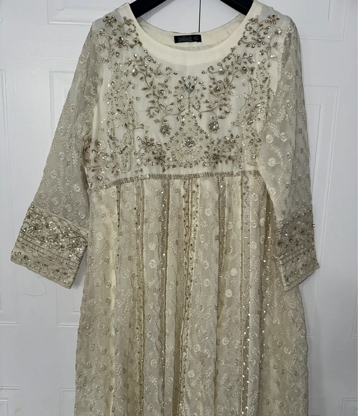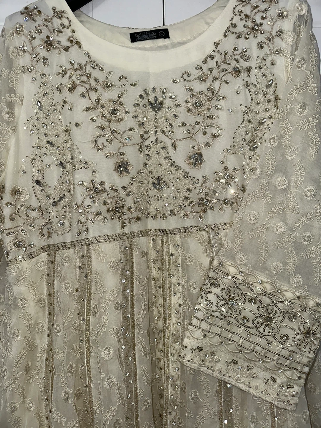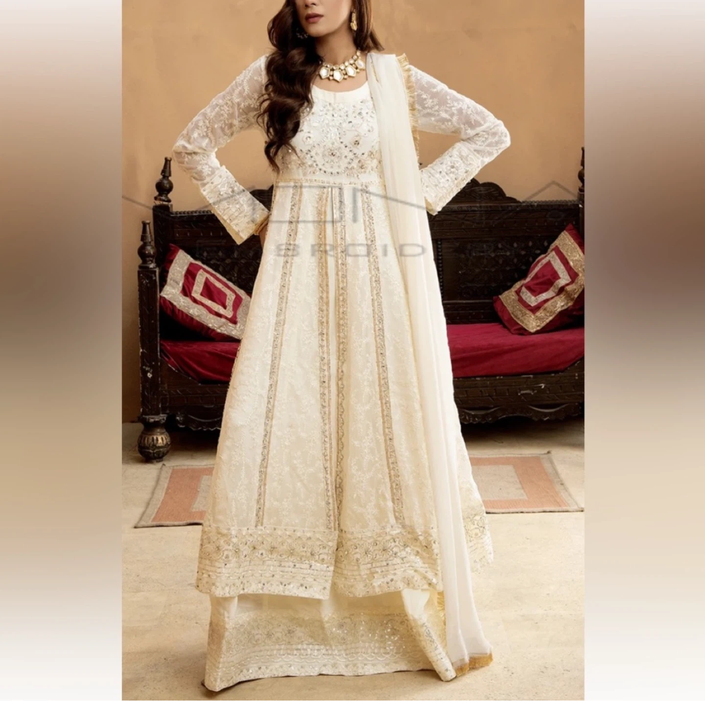 Exquisite white long gown, embellished with meticulously crafted stone embroidery, evoking an aura of timeless beauty. Paired with an ethereal chiffon dupatta delicately accented with intricate kiran lace trim, and embroidered trousers, this ensemble excudes grace and charm, making it the perfect choice for any formal affair.