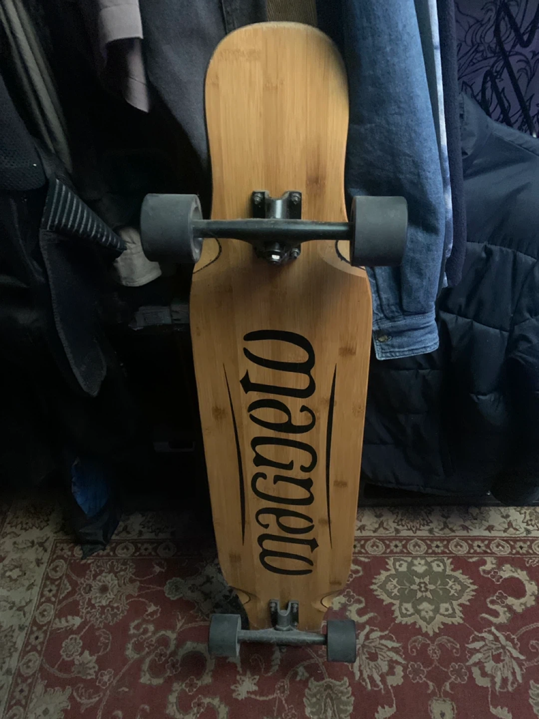 This is a Magneto longboard skateboard. It's made of bamboo and has a classic shape. Perfect for cruising around town, just don’t ride as much.