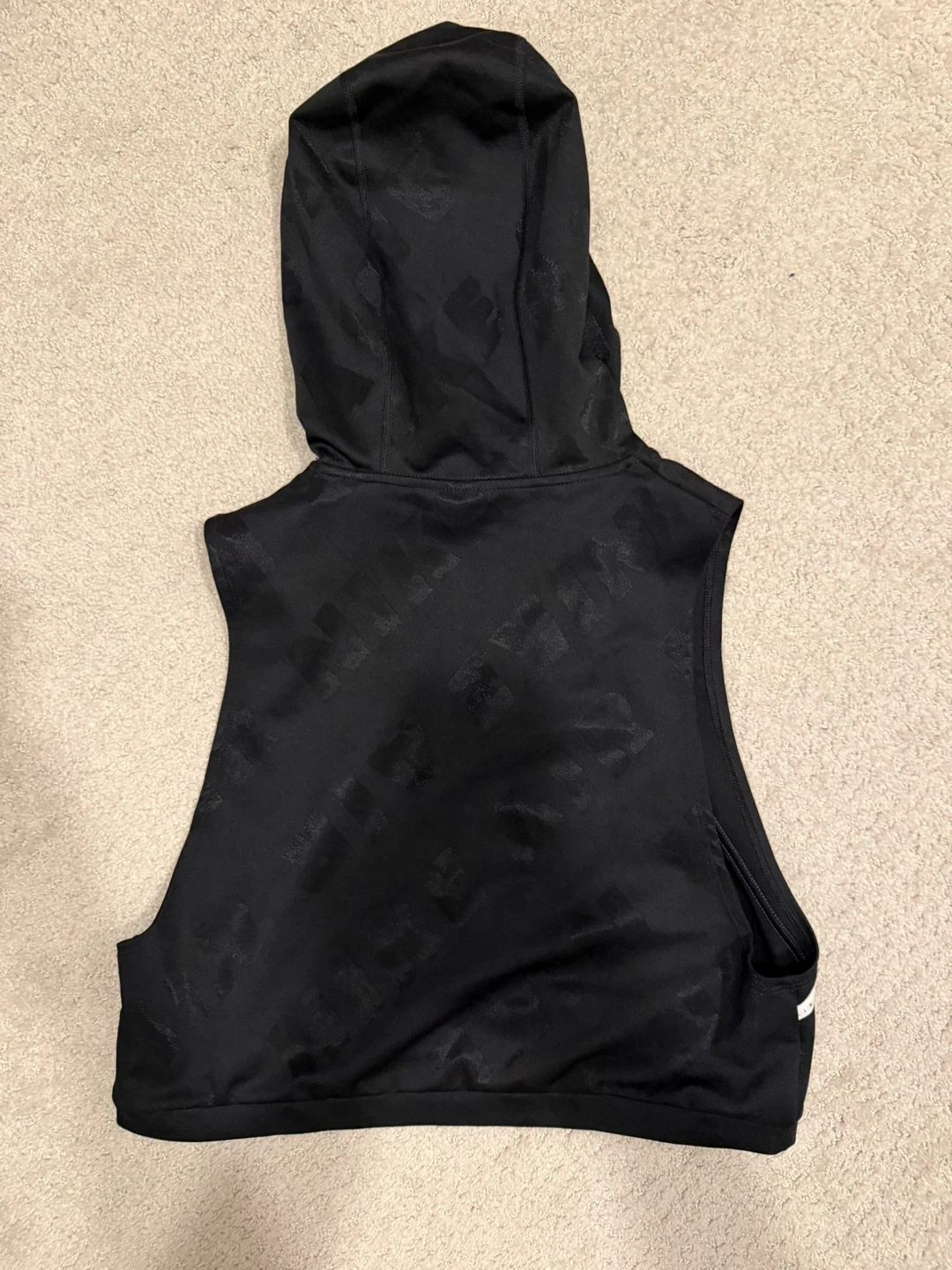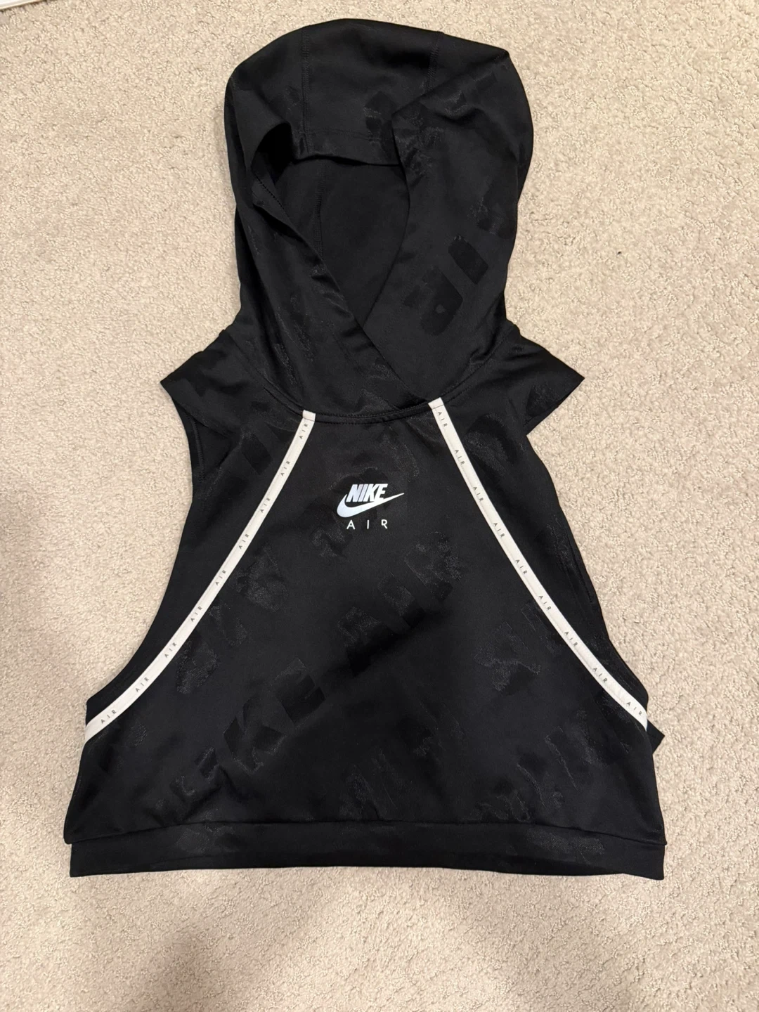 Black Nike Air sleeveless cropped hoodie. All-over repeating Nike Air logo pattern. Features white Nike Air branding on the front.