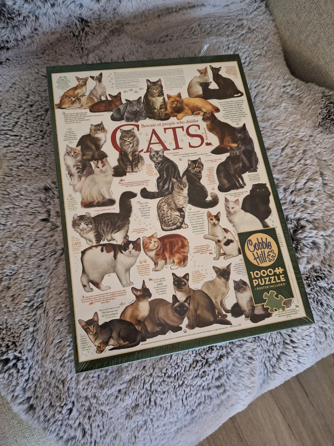 Cobble Hill "Cats" puzzle featuring various breeds of cats. It has 1000+ pieces and includes a poster. This puzzle is great for cat lovers of all ages.