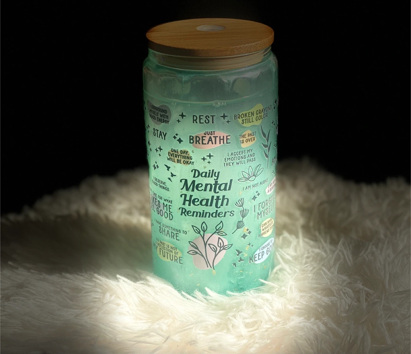 60This is a cute glass tumbler with a bamboo lid. It has lots of positive reminders printed on it like "Just Breathe", "Stay", and "I am not alone"! Perfect for your daily dose of water and mental wellness