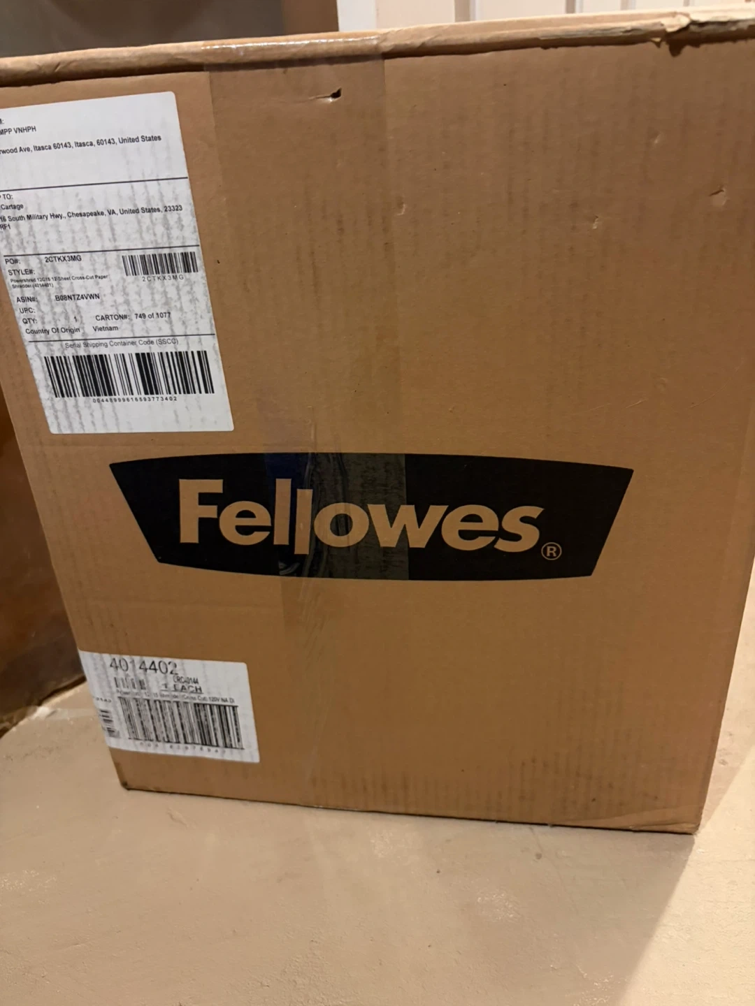 Fellowes Powershred 12015 shredder. It's a 12-sheet cross-cut paper shredder. Country of origin is Vietnam. Includes original box.