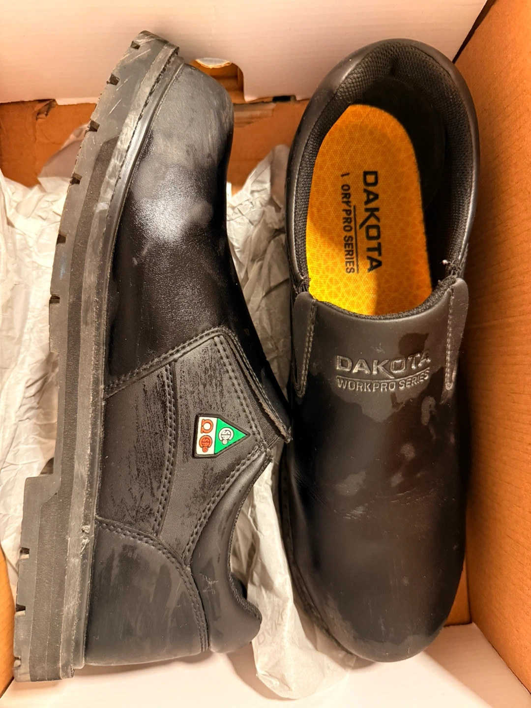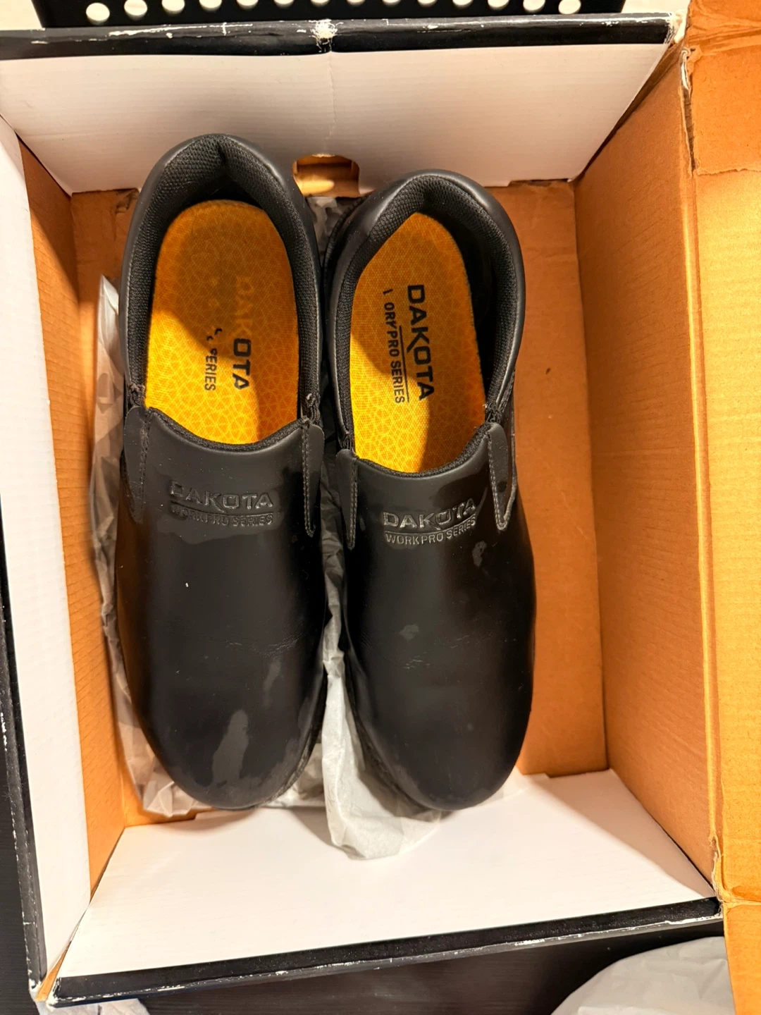 Selling a pair of Dakota anti-slip work shoes in black, size 9. They're in great shape and come in the original box. The receipt shows they were originally $95. Perfect for anyone needing reliable footwear for work! Price negotiable