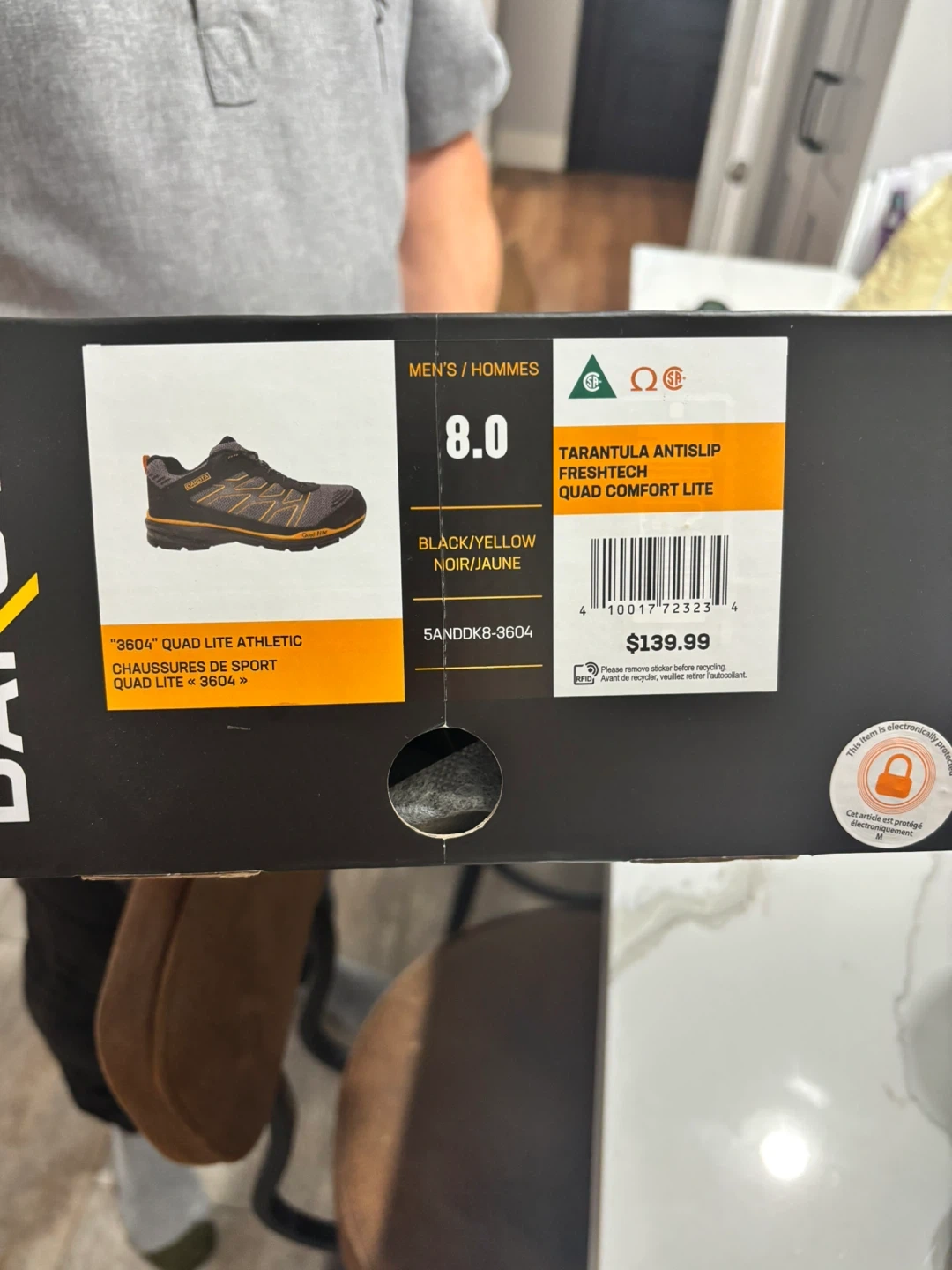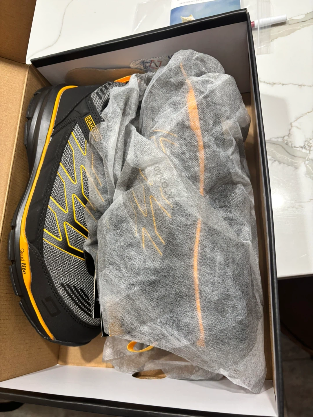 Selling a pair of Dakota Tarantula Antislip FreshTech shoes in men's size 8. The shoes are black and yellow and come in the original box. They are the Quad Comfort Lite athletic style. Originally bought for $139.99