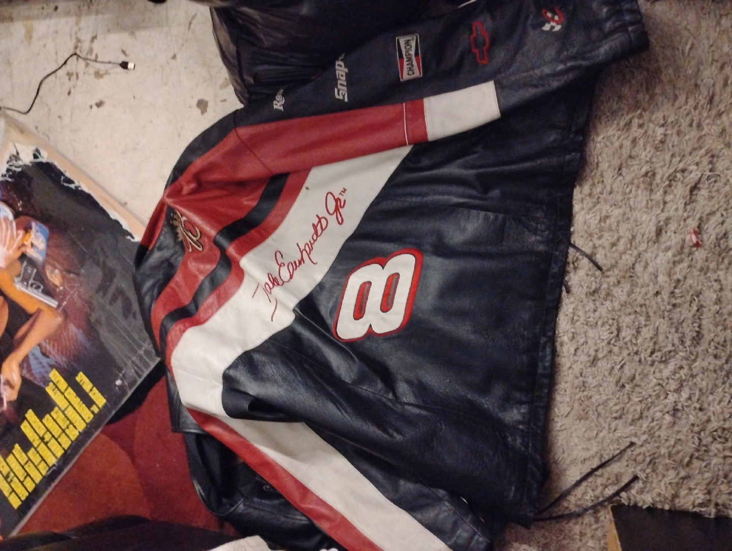 10Selling a Dale Earnhardt Jr. #8 racing jacket. It features Champion and Snap-on logos. The jacket is black, red, and white.