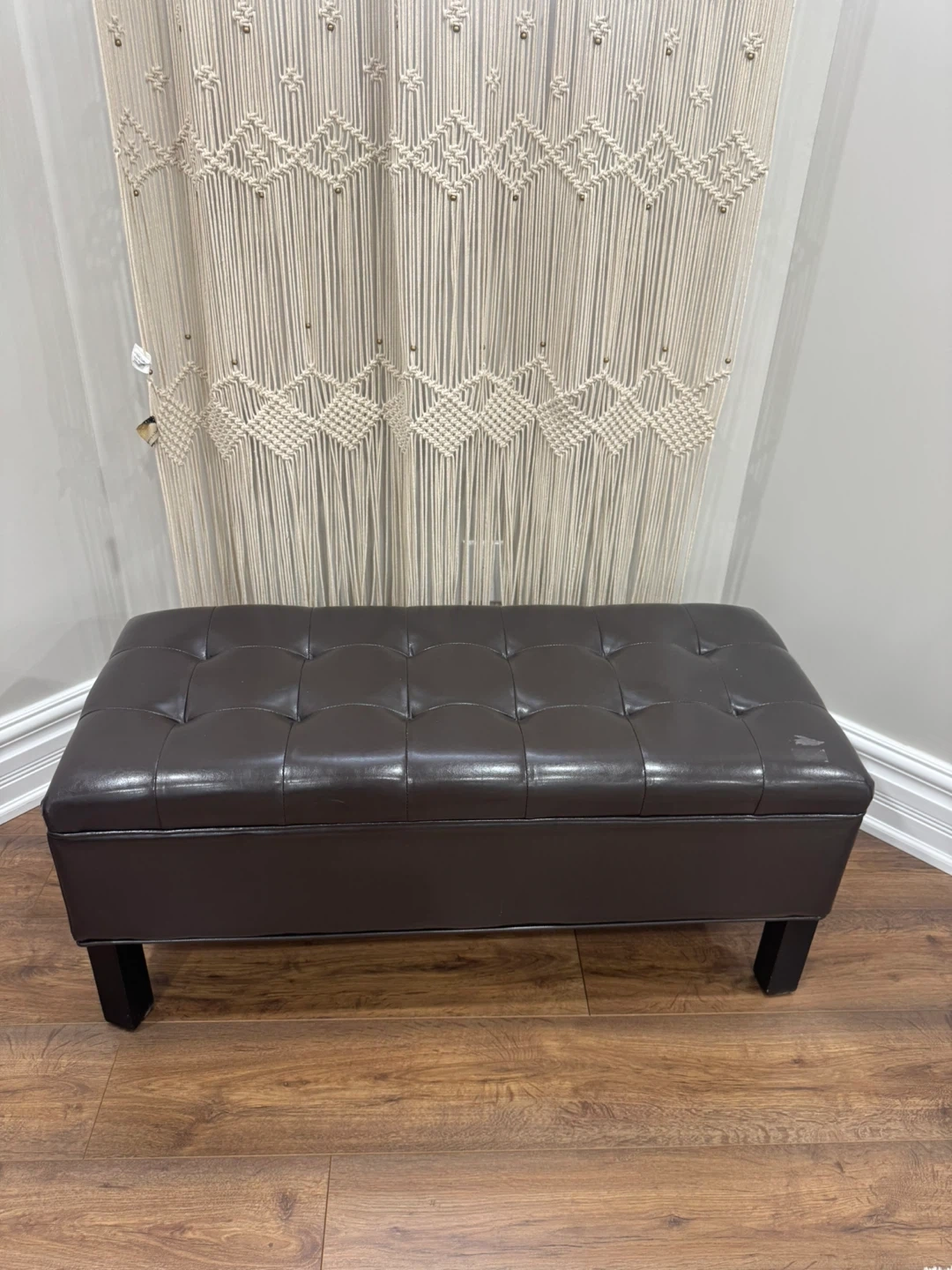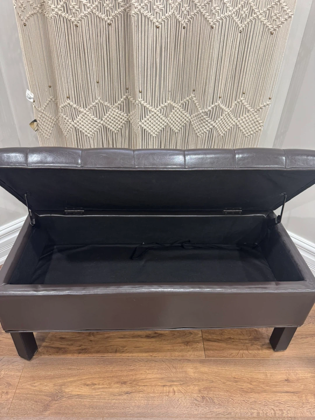 Selling a handy storage ottoman bench! It's a dark brown colour and has a faux leather finish. Great for extra seating and discreet storage in any room