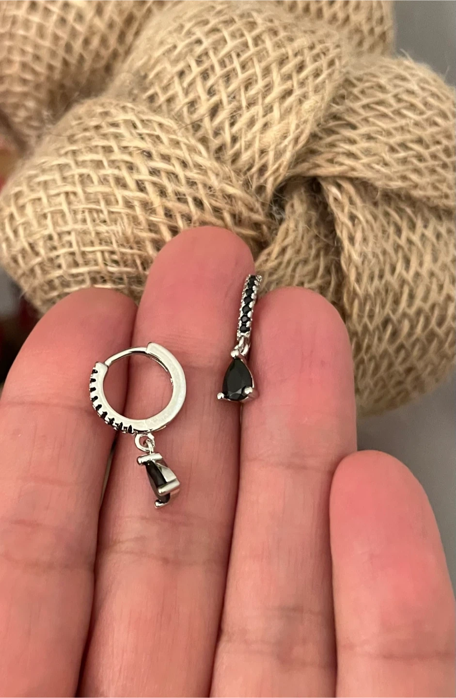 125Cute pair of silver-plated earrings with dangling black stones. The needle is sterling silver