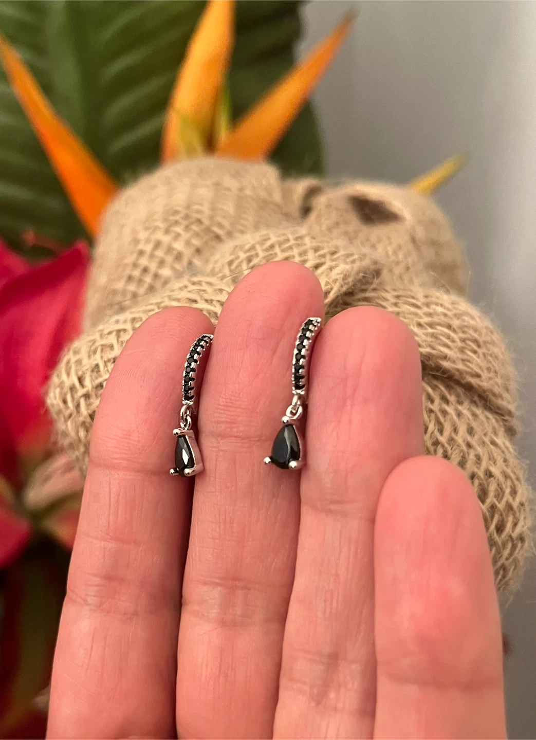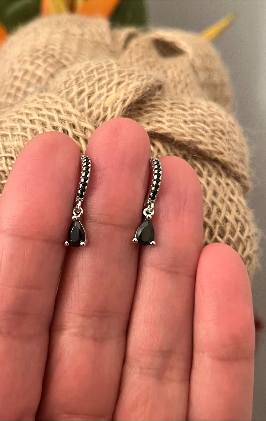 Black Teardrop Dangle Earrings. Silver plated