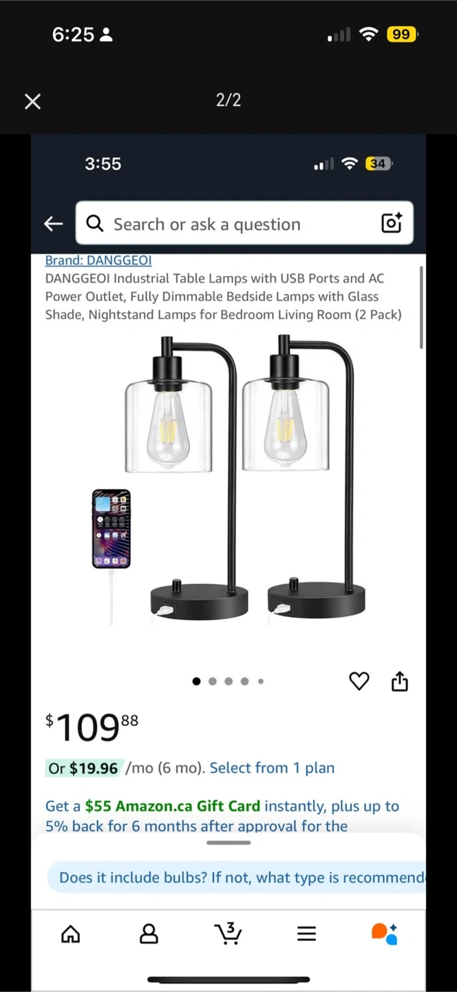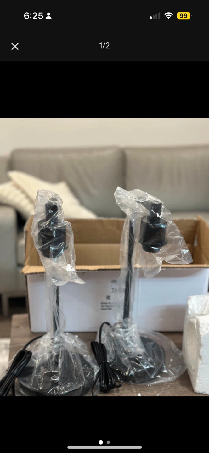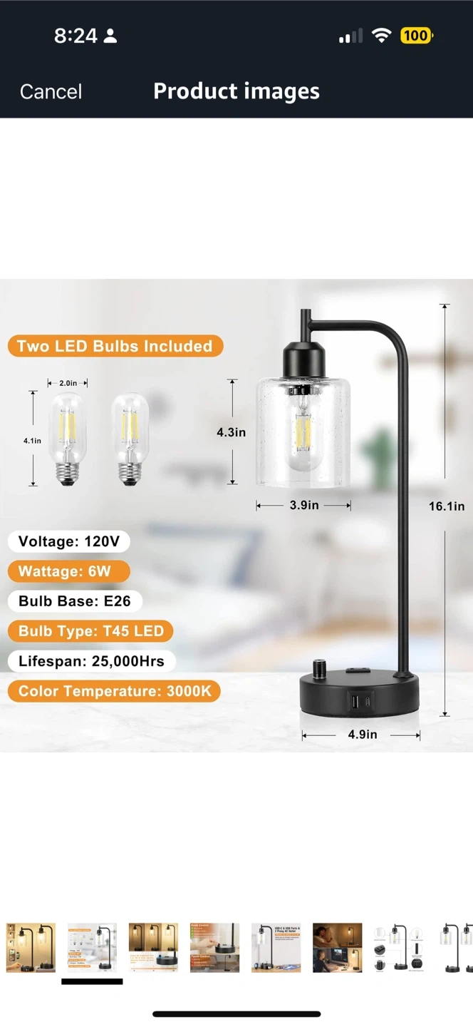 Selling a set of DANGQEI industrial table lamps, perfect for your bedside or living room! They come with USB ports and AC power outlets. These lamps feature a fully dimmable bedside design with a glass shade. Two LED bulbs are included, with a lifespan of 25,000 hours. The original price was $109.88