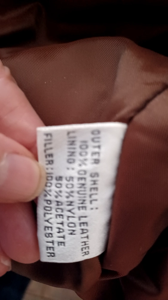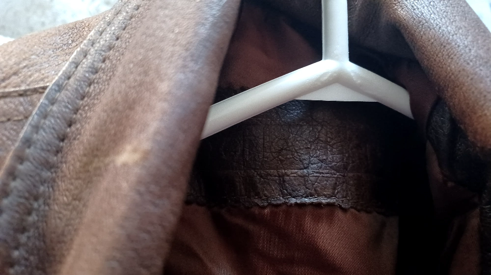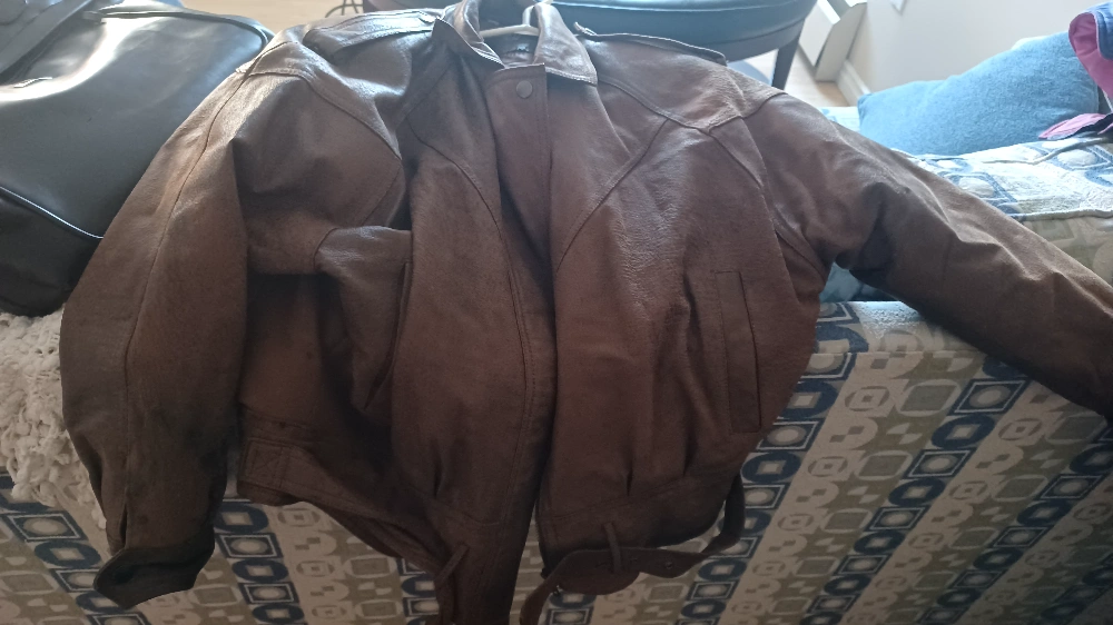 17Genuine leather jacket with a belt. Brown in colour. Has pockets and a button closure.