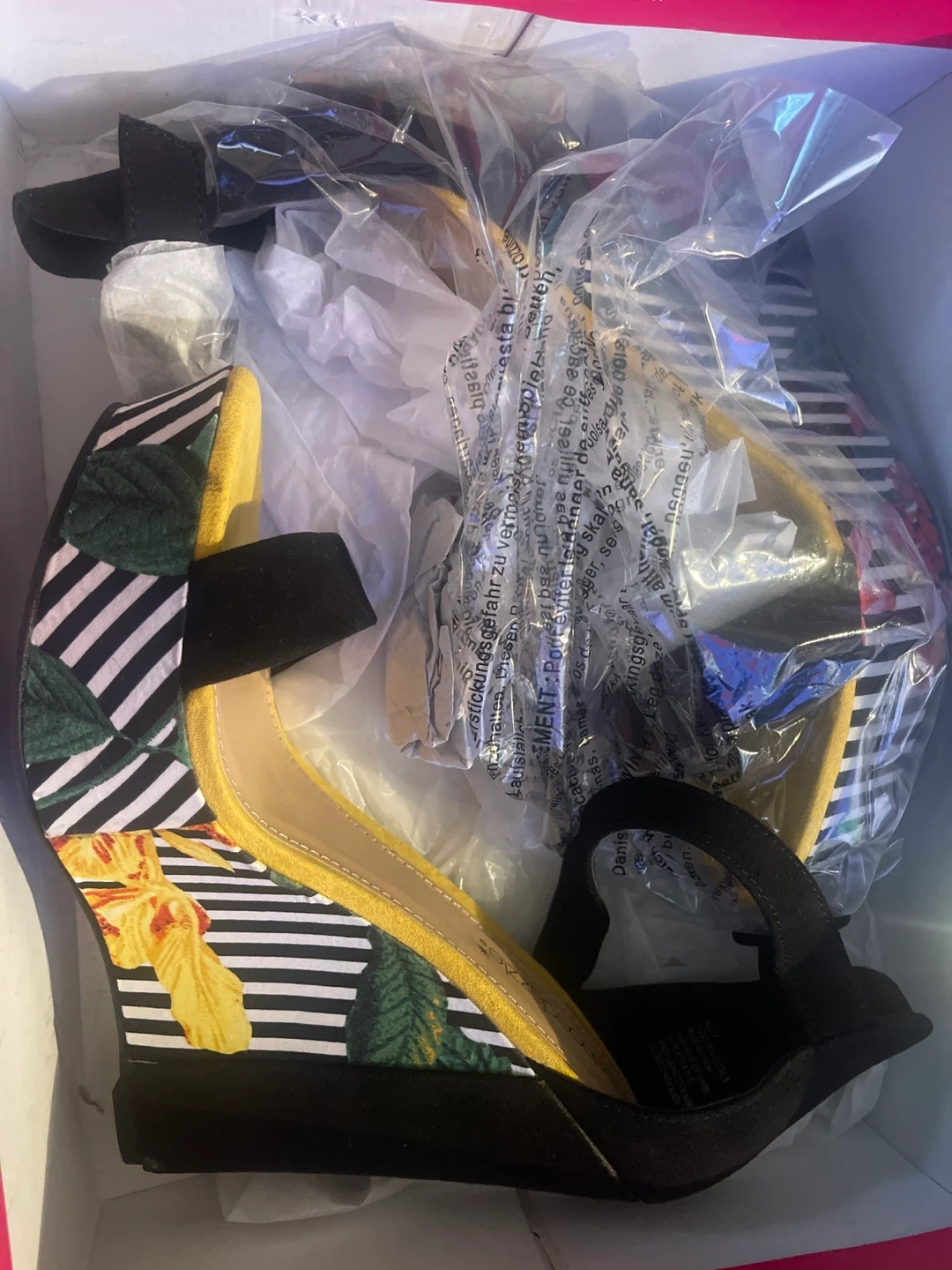 37Selling a pair of shoe dazzle wedge sandals in size 8. They feature a unique floral and striped pattern. Comes with the original box!