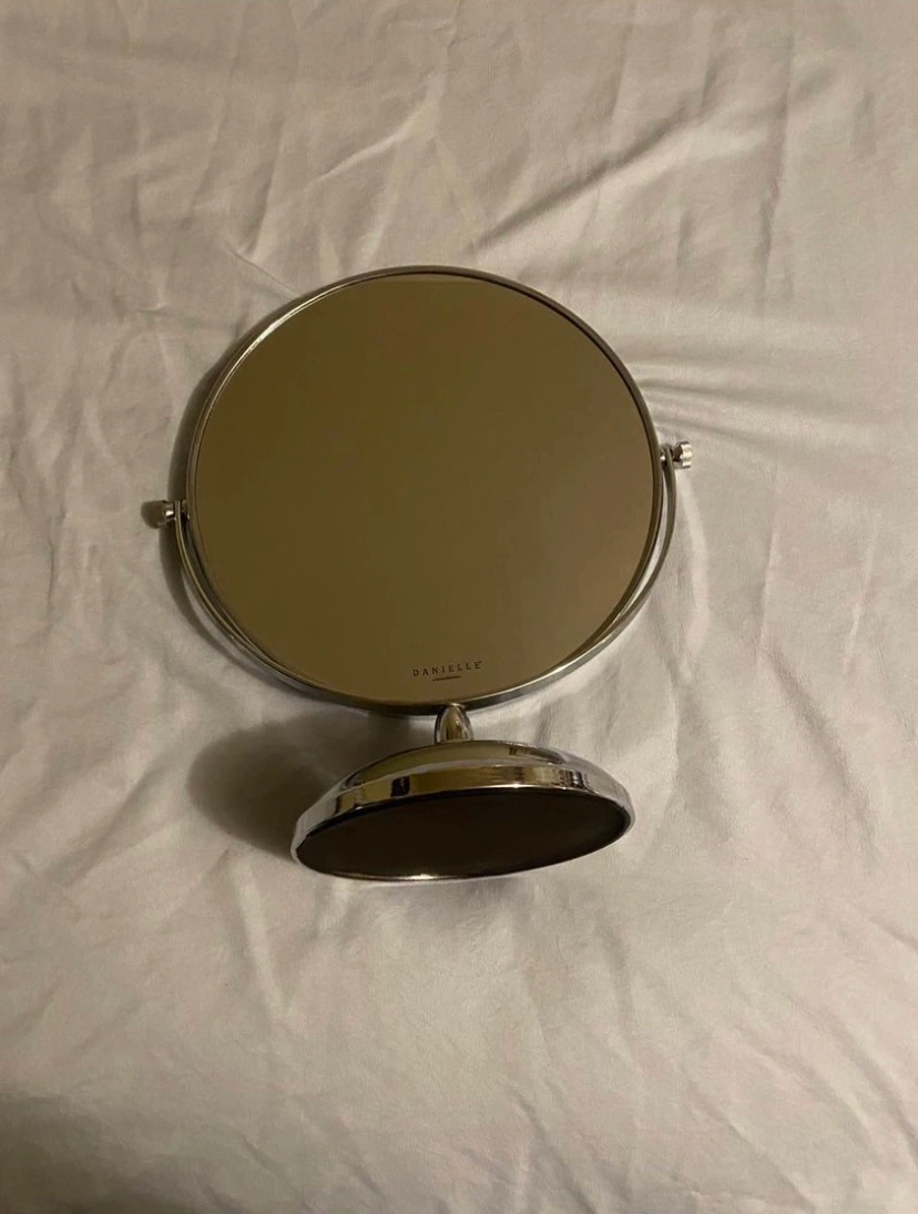 A round, silver makeup mirror with a stand. The mirror rotates and the stand is round and has a large, flat base.
