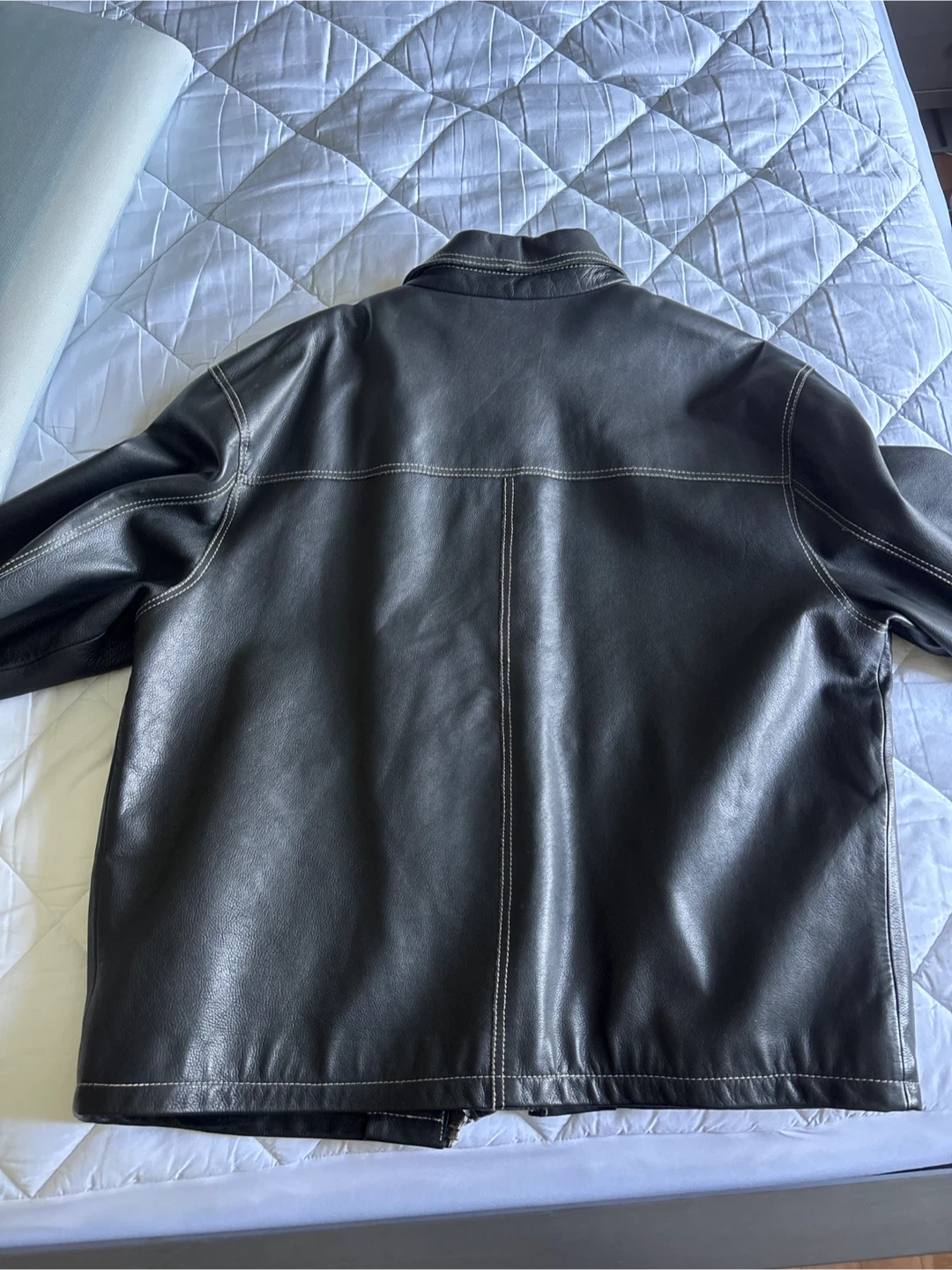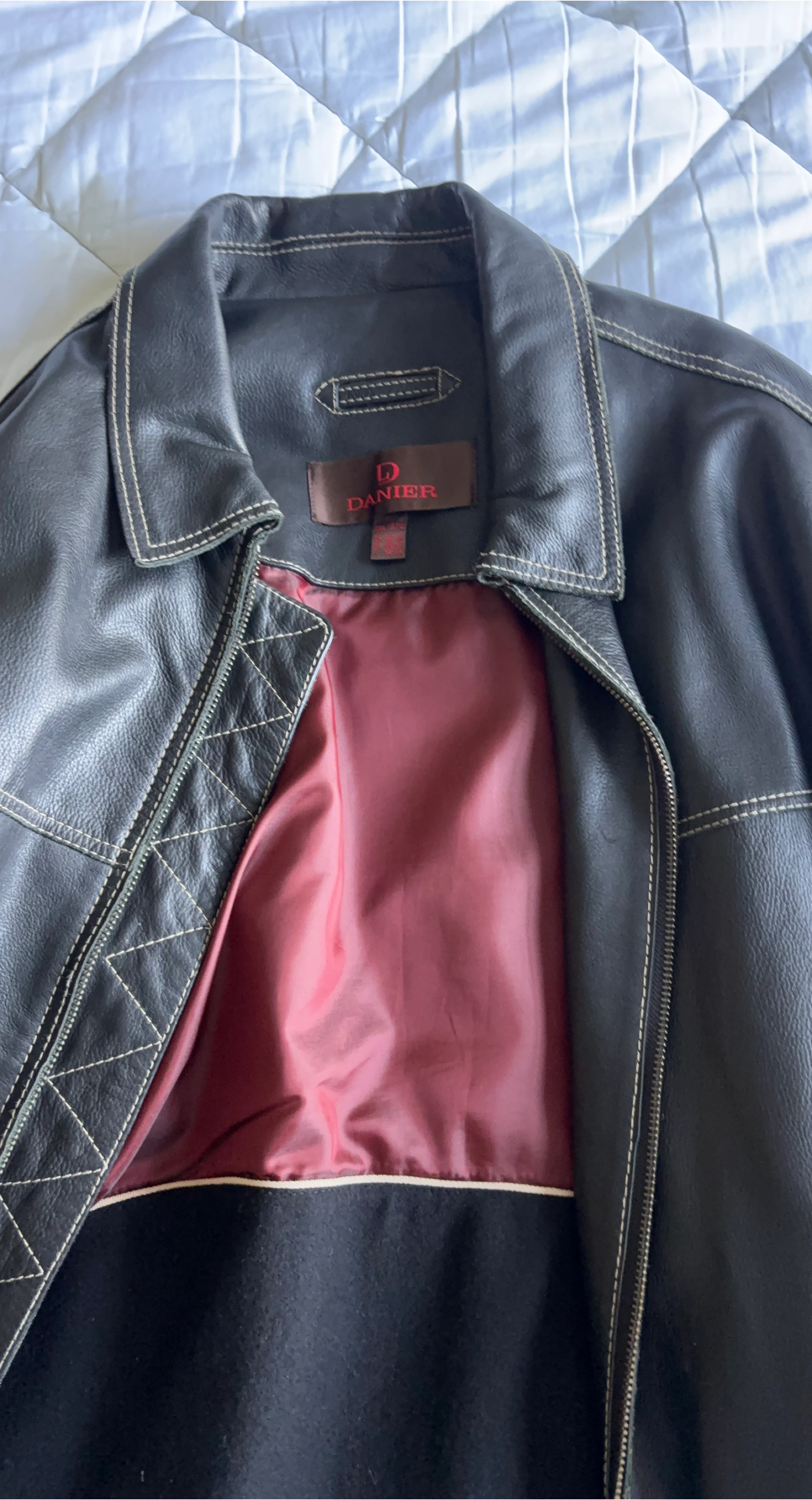60Here's a stylish Danier leather jacket in black, size 2XL. It's in great condition and ready for a new home. The jacket features a red lining and detailed stitching.