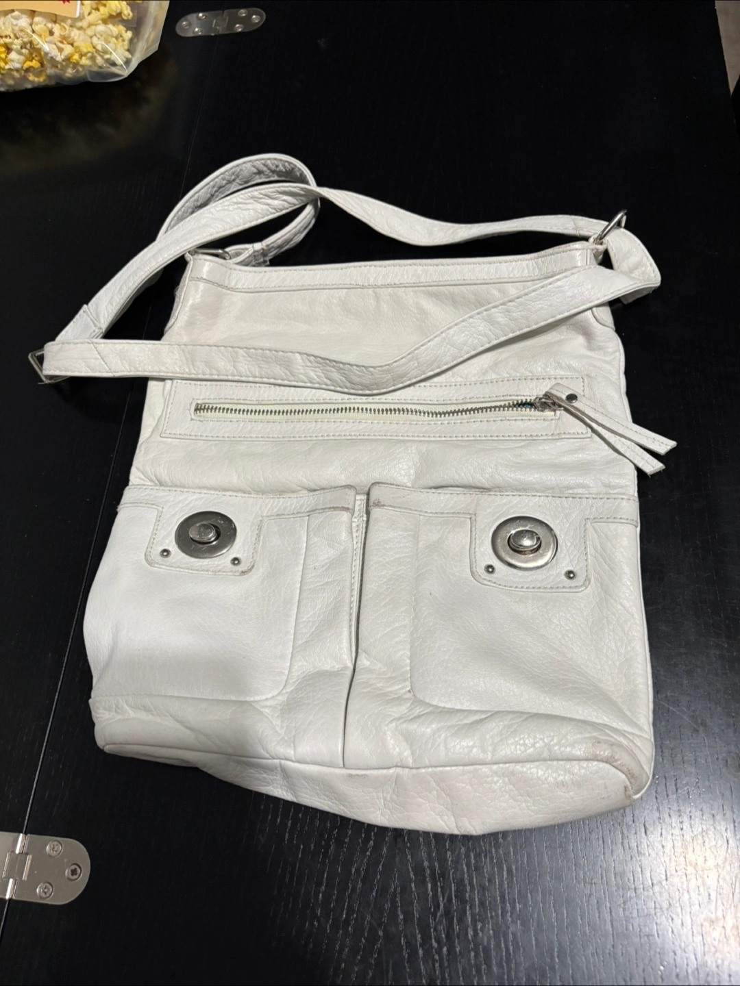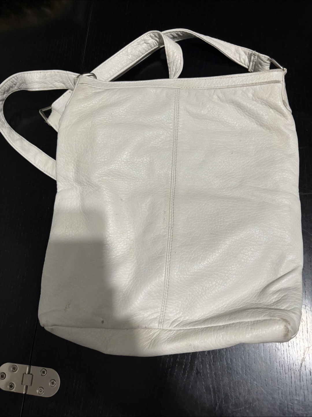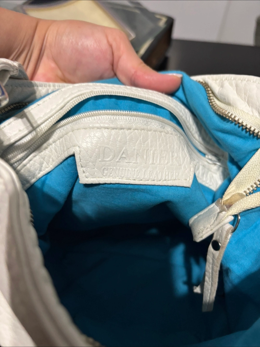 99Here's a stylish Danier genuine leather shoulder bag in white! It's perfect for everyday use and has a nice, clean look. The interior is lined with a bright blue fabric, adding a pop of colour. It's in great condition and ready for a new home. Needs a little cleaning with a leather cream but in great condition with no wear on the inside at all.
