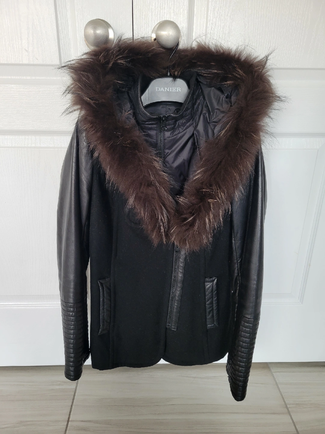 10DANIER Italian Leather jacket. It features a beautiful fur-trimmed hood and a sleek design. Wool and Leather. Perfect for staying warm and fashionable during the colder months! Fits like a Small Price is firm Pickup in Bowmanville