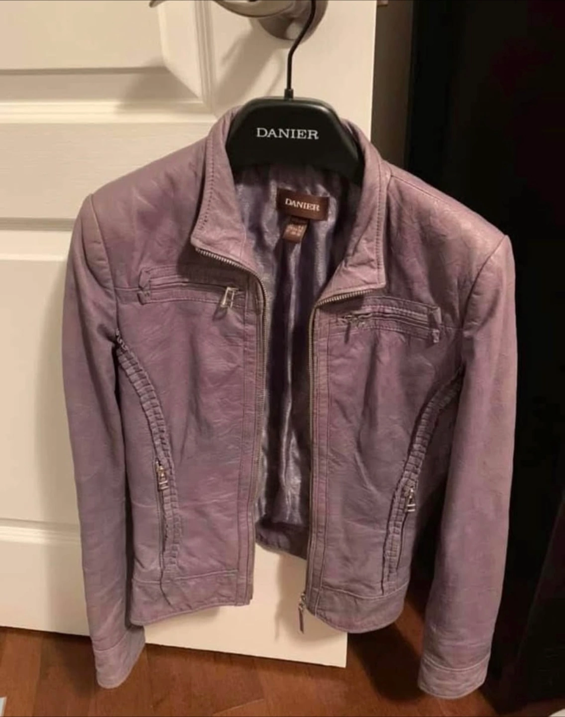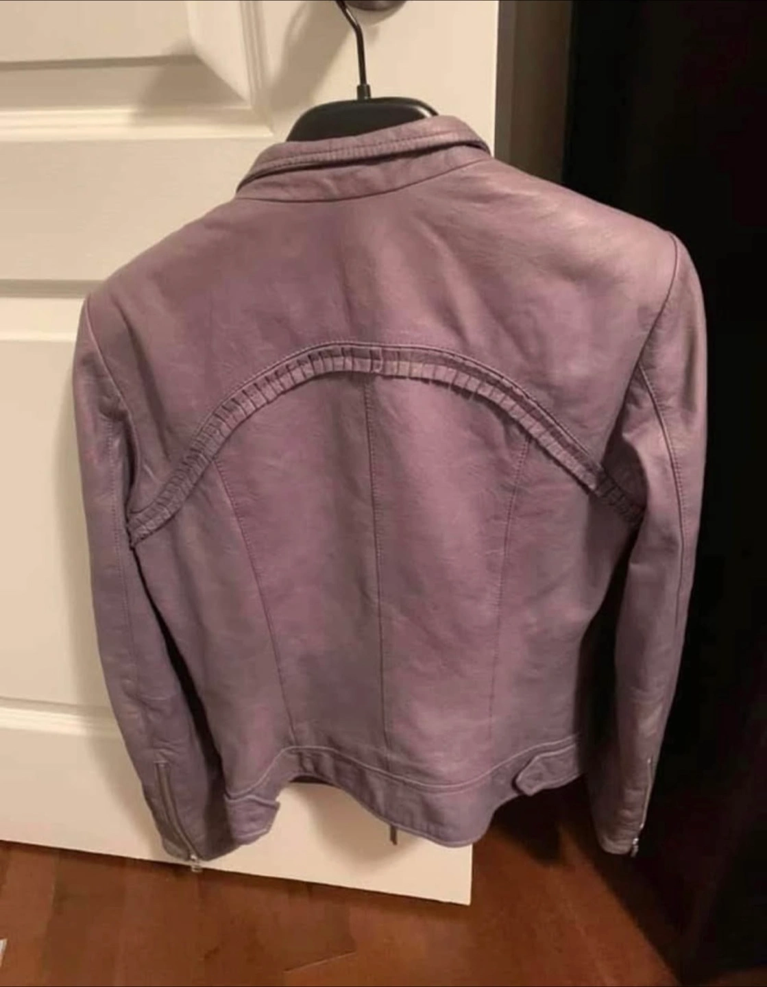 Beautiful lavender leather jacket. Zipper closure. Long sleeves. Two zippered pockets. Excellent condition.