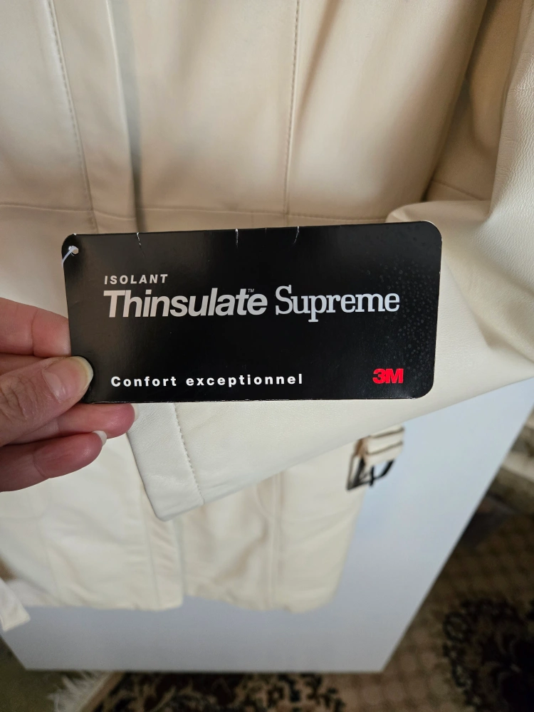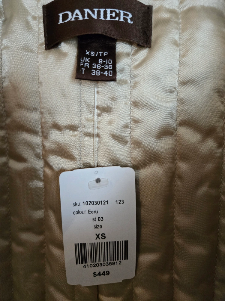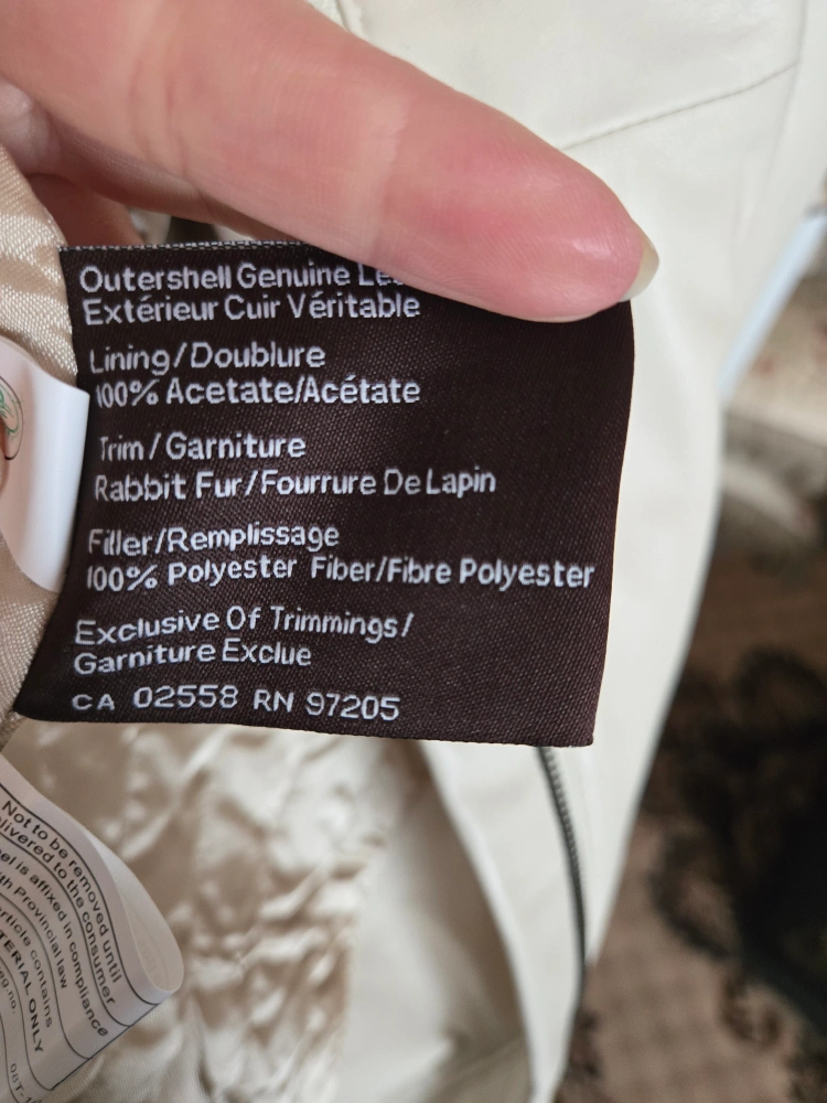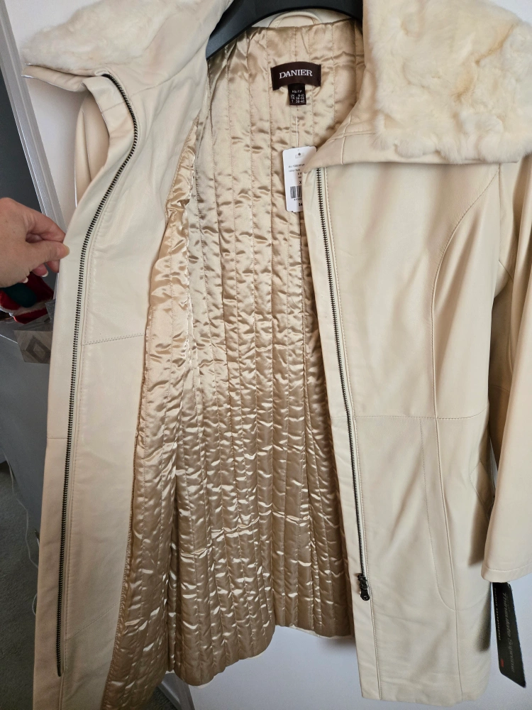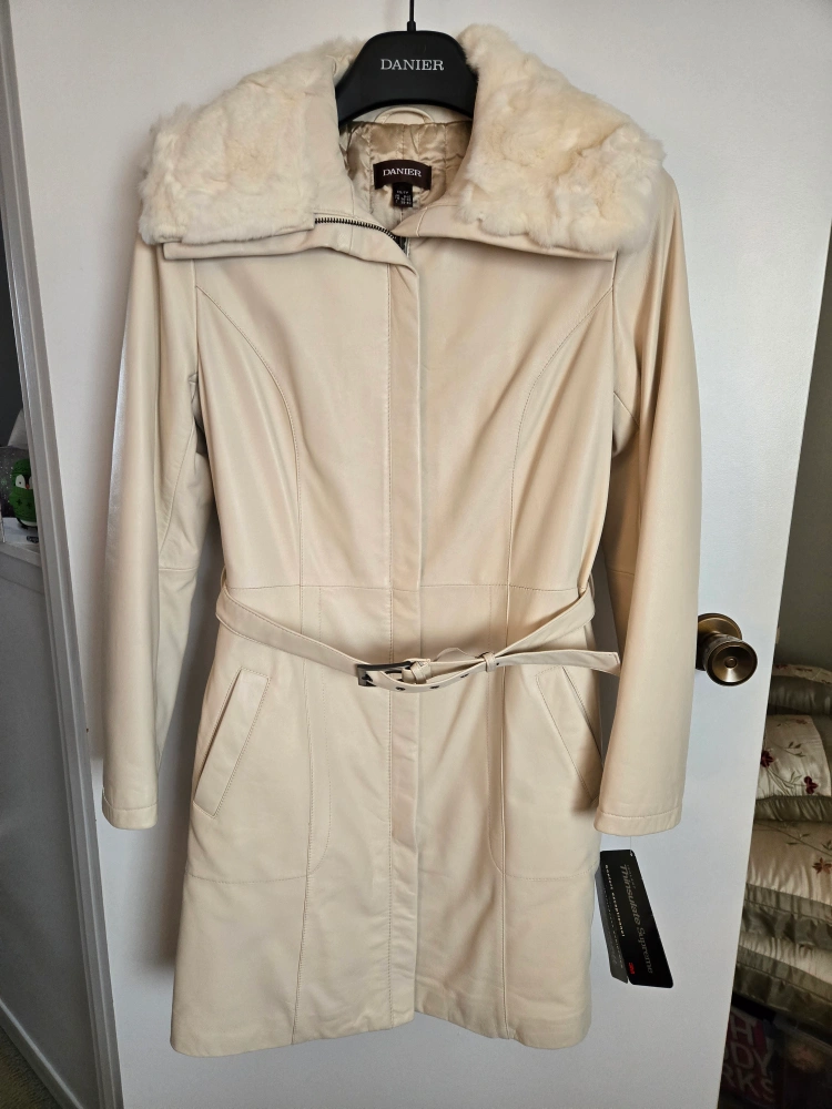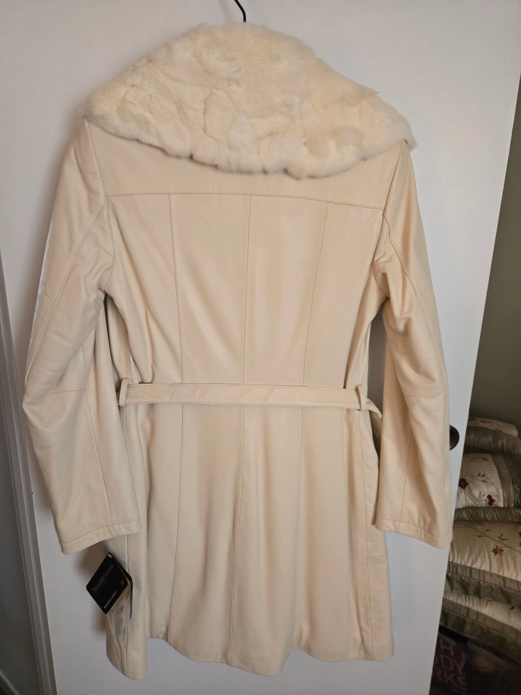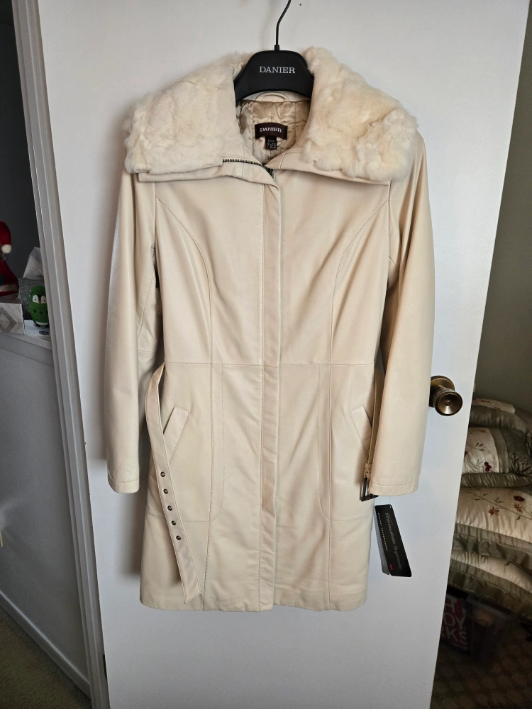 60Cream coloured leather winter coat. Extra small. Just below knee length. Features a rabbit fur collar and a belt. Insulated with 3M Thinsulate Supreme. Brand new with tags.