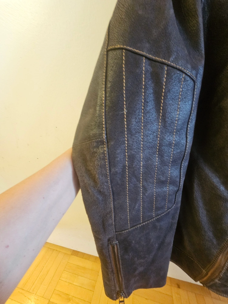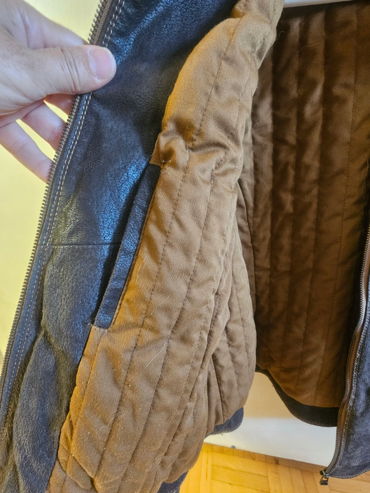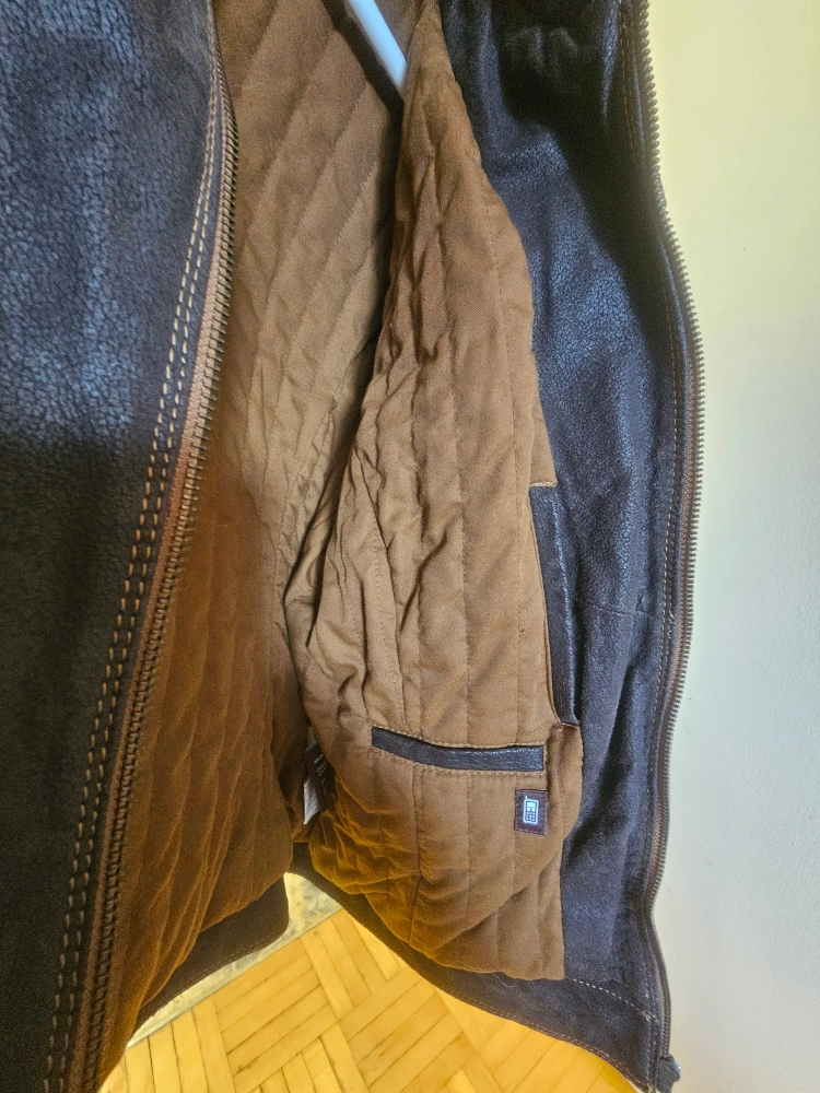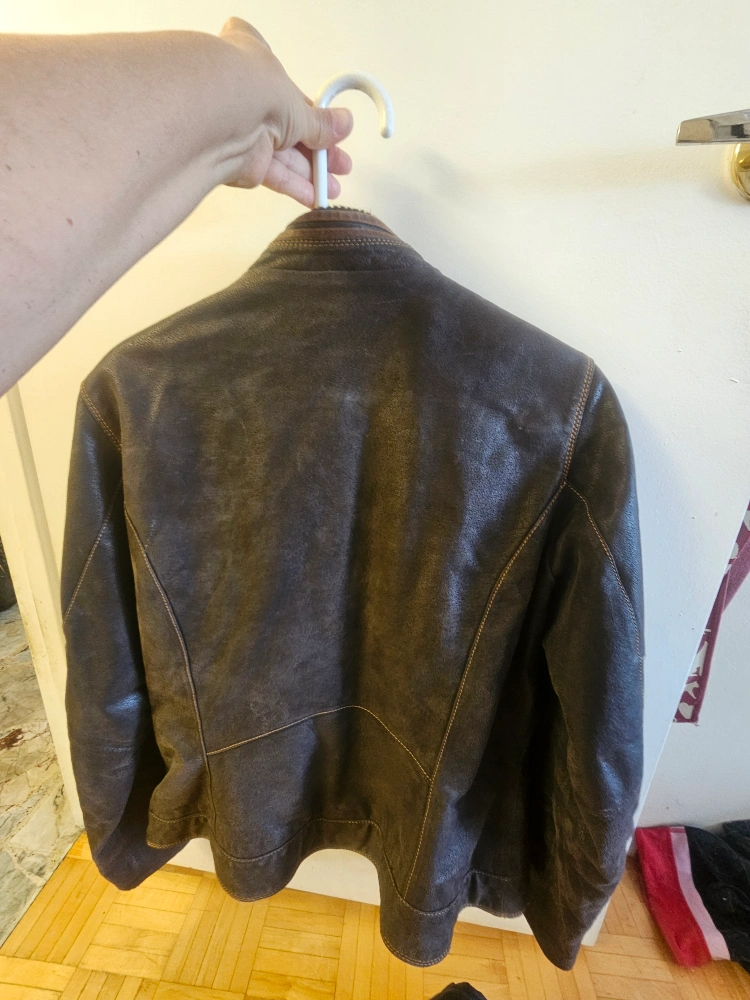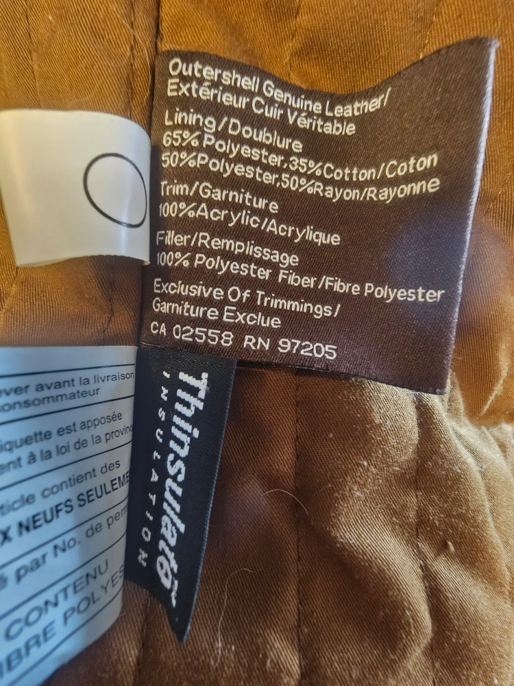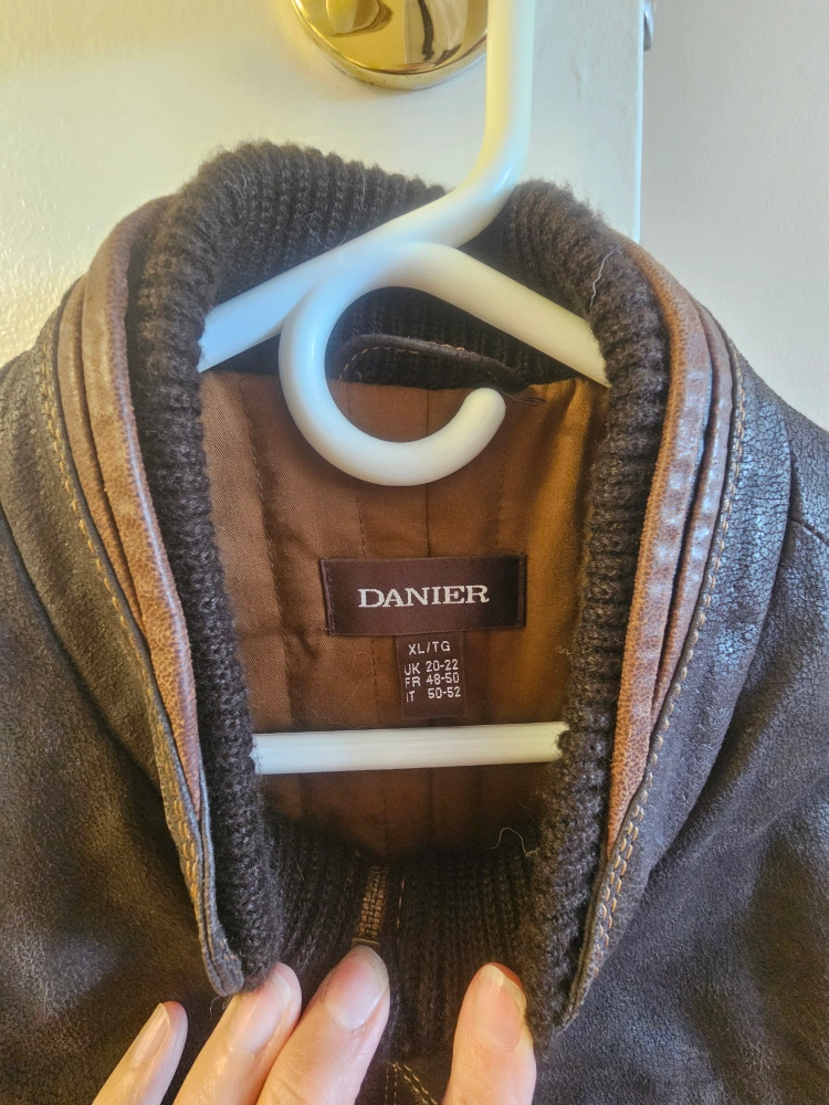 90Here's a Danier leather jacket in size XL. It has a brown quilted lining and a stylish design! It's been worn not even a handful of times. The leather was always not shiny. made to look that way. Thinsulate lined so it's not only stylish but warm and has 4 outside zippered pockets and 3 inside pockets. It had a knitted collar as well for more comfort. Beautiful jacket that will last years to come. It's a women's jacket but could be unisex IMO