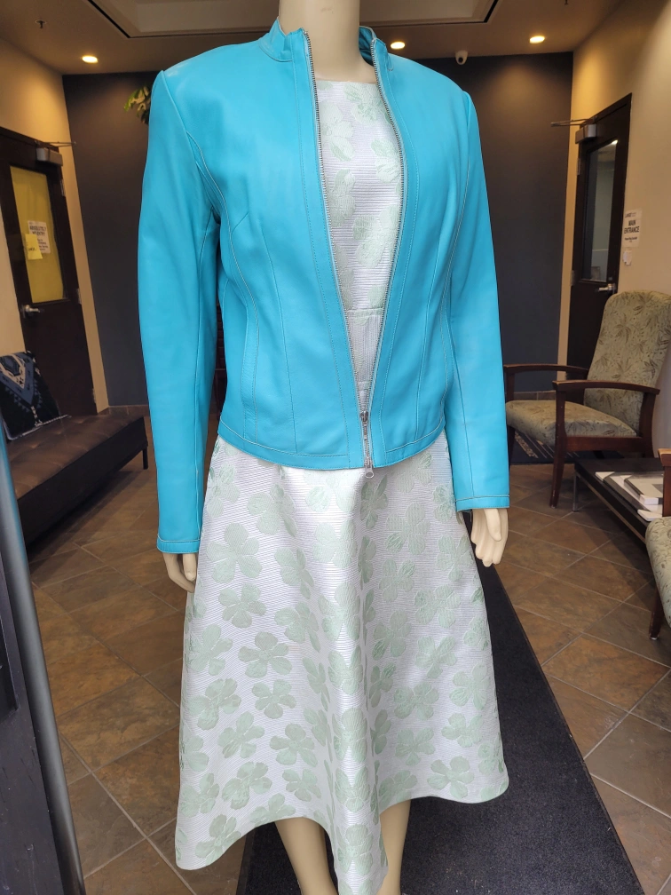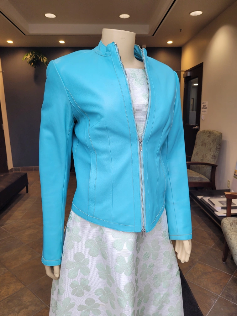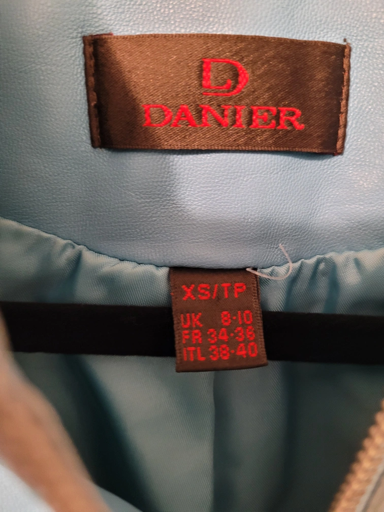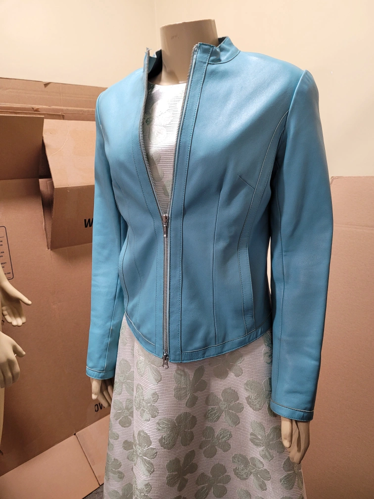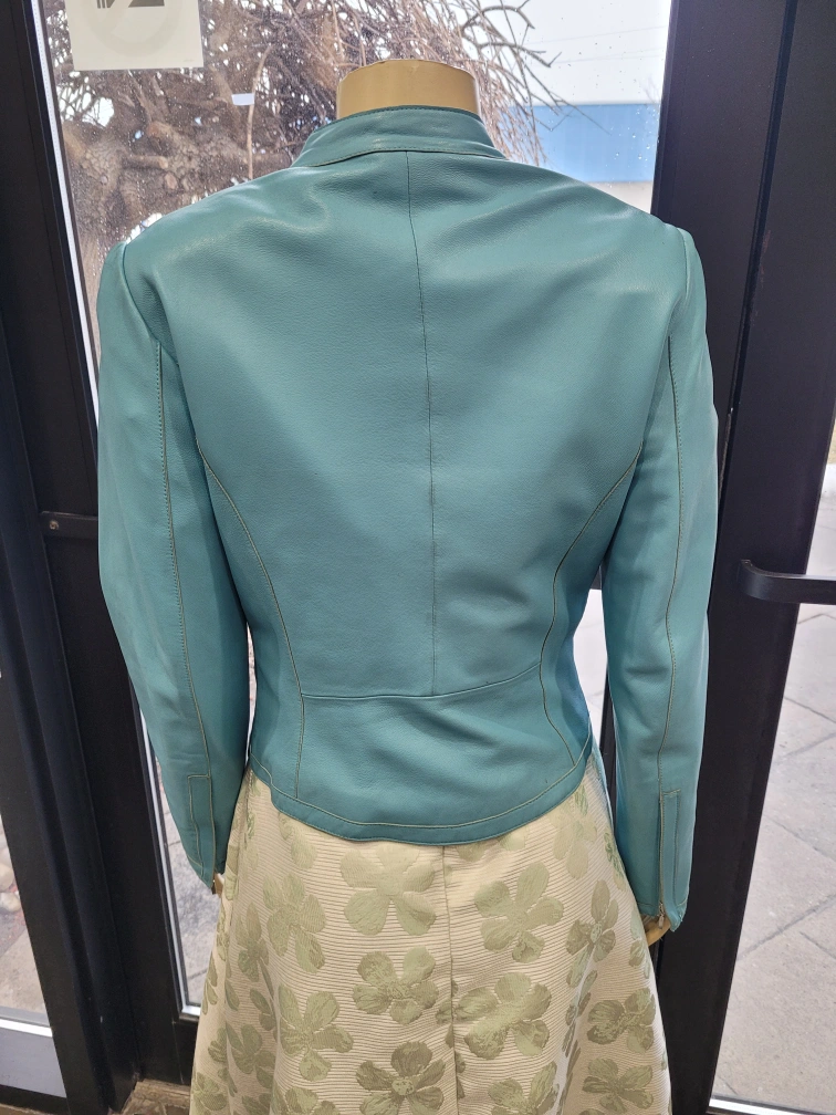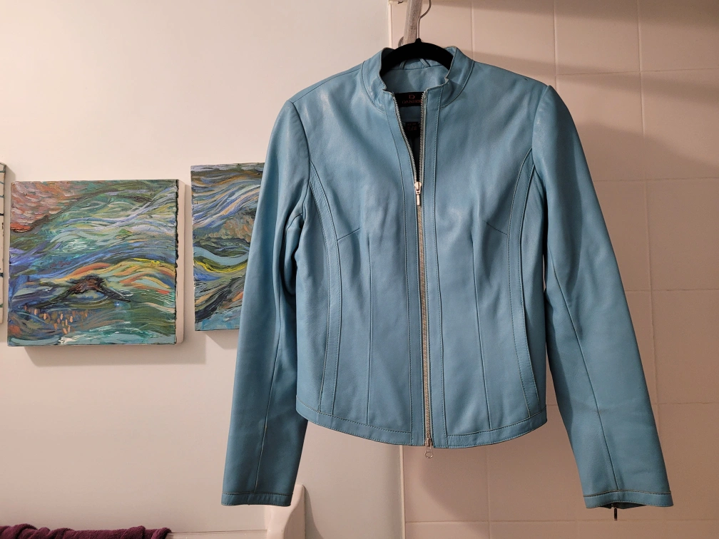 Beautiful light blue bomber leather jacket. Zip front closure. Size XS/TP. The colour is shown in a few lighting and natural sun. Its a robin egg bluey turqoise (hint of green in the blue), the pics make it look like a light blue or baby blue. Tags say XS but would fit small medium if you like it snug and dont want to wear a lot of layers under it. Must pickup. Please. no etransfer or long holds. this is a cash price. bring cash. This is in storage and I will meet you there. I can access the building during 8 to 430 Monday to Friday. No one is there outside of those times.