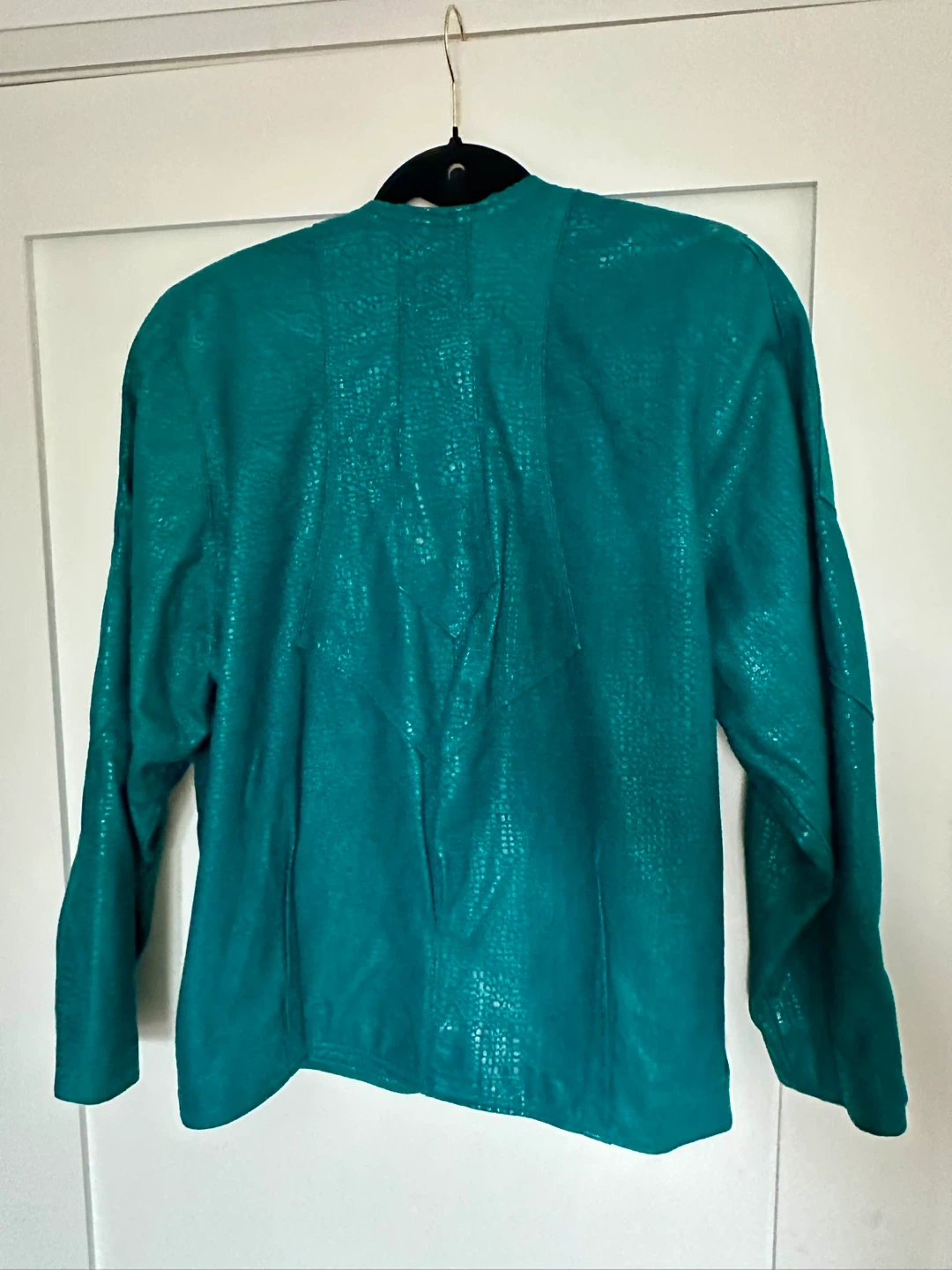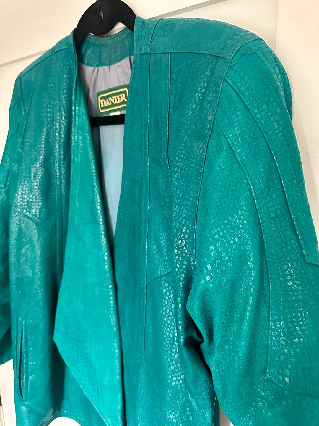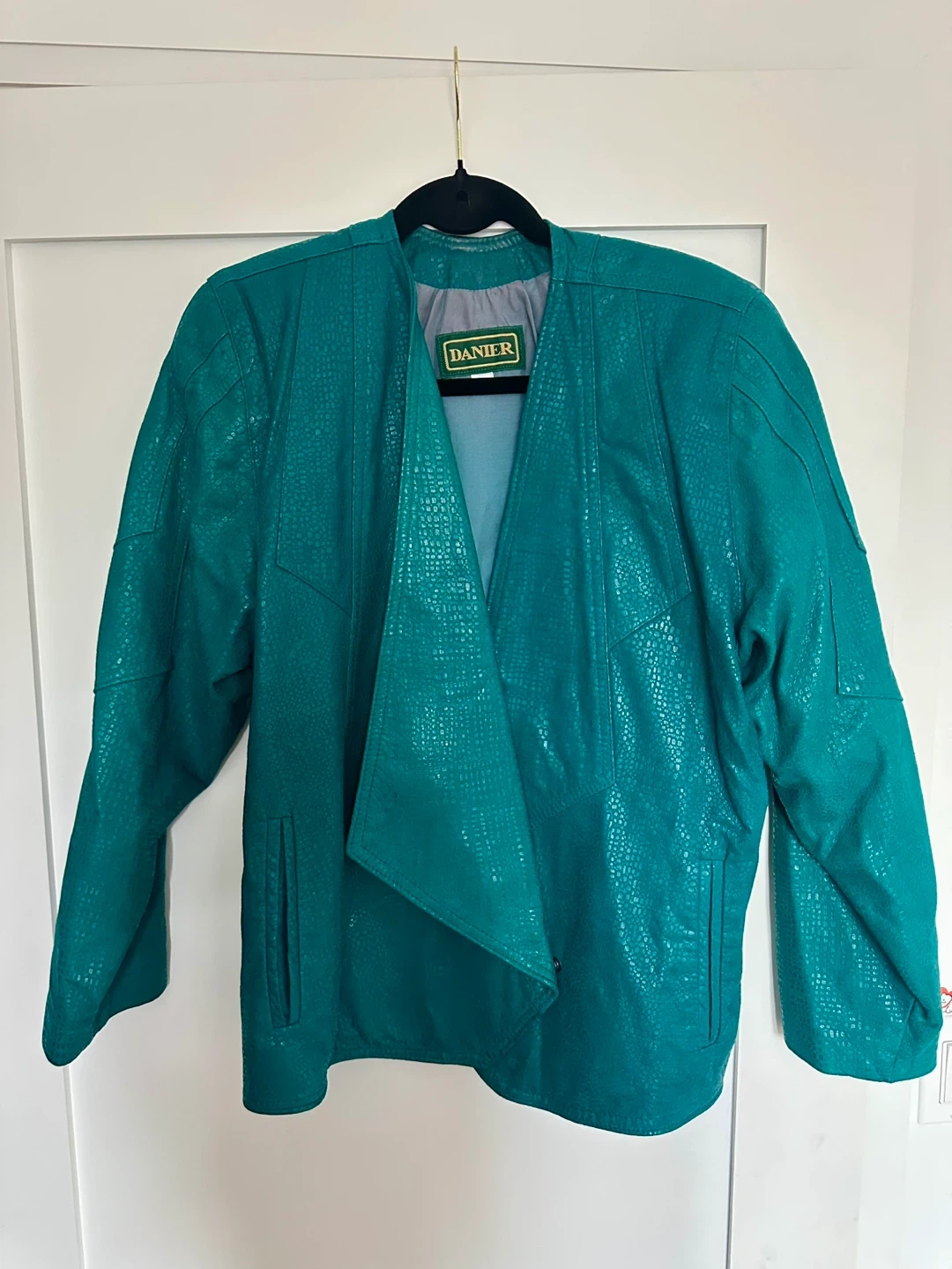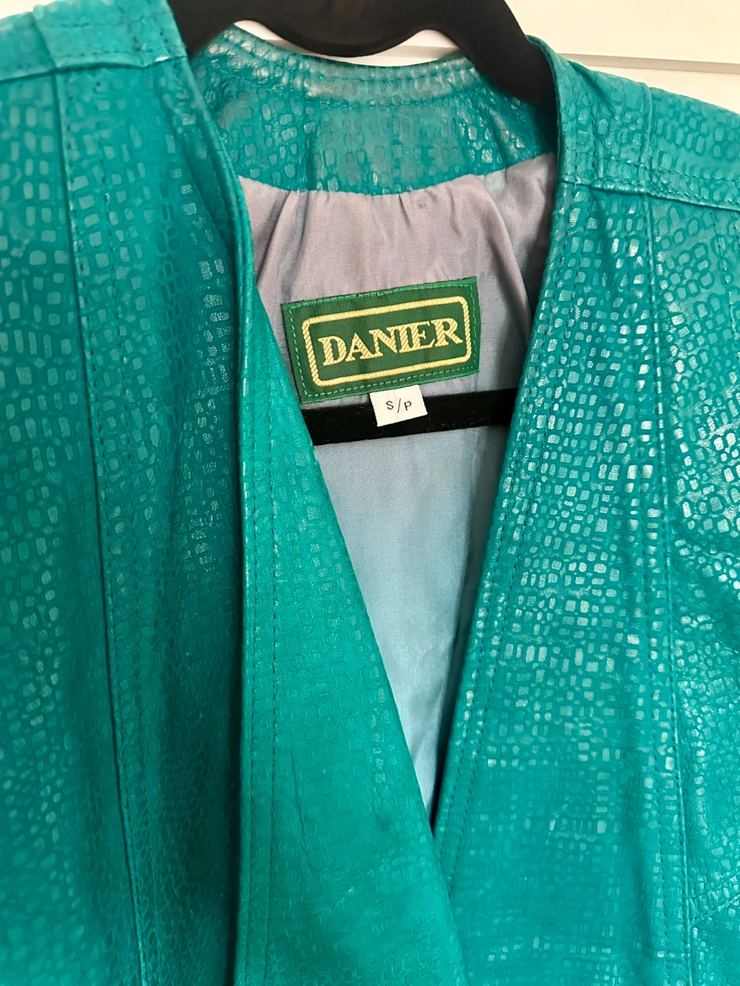 Selling a stylish Danier leather jacket in a vibrant teal colour. It's a size S/P (Small/Petite). The jacket has a unique textured pattern and a comfortable fit. Perfect for adding a pop of colour to your wardrobe!