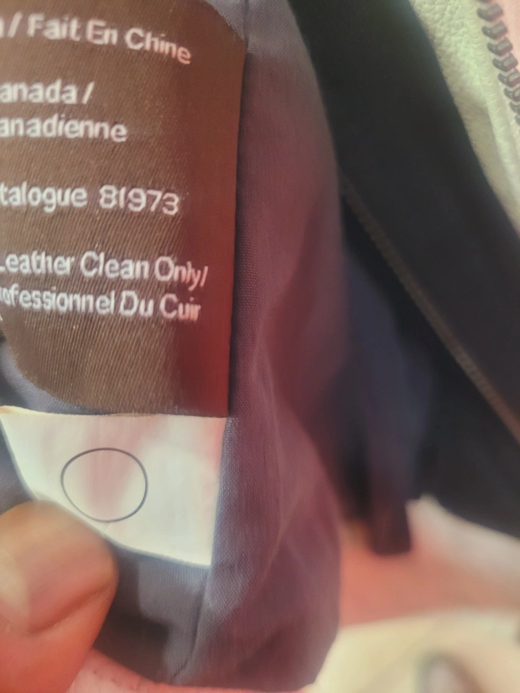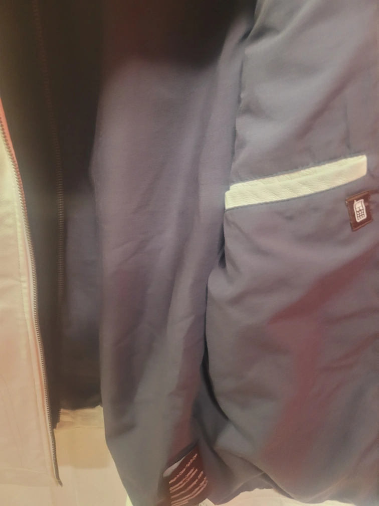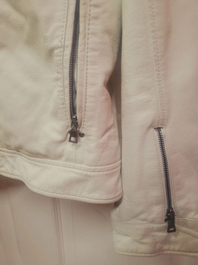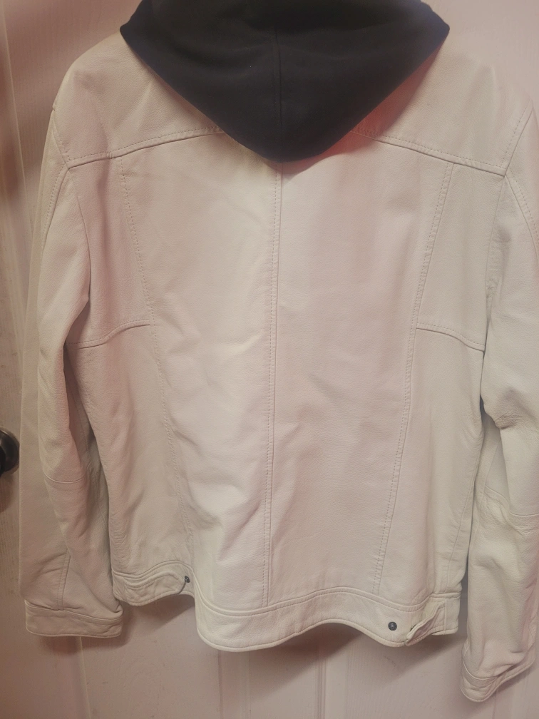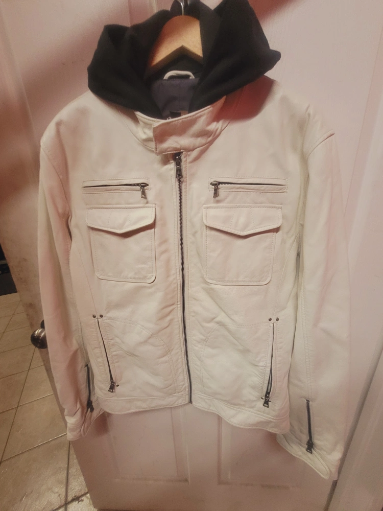 15Here's a stylish white leather jacket from Danier! It features a black hood and lots of pockets. The tag indicates the style number is 81973. The jacket is a size medium.