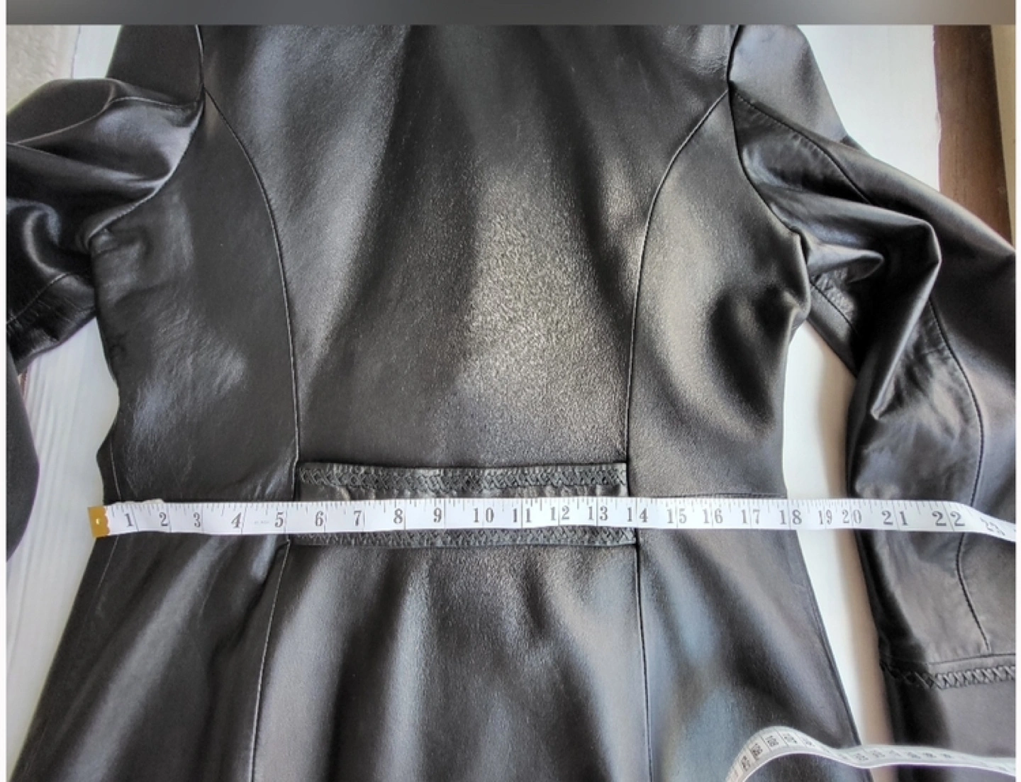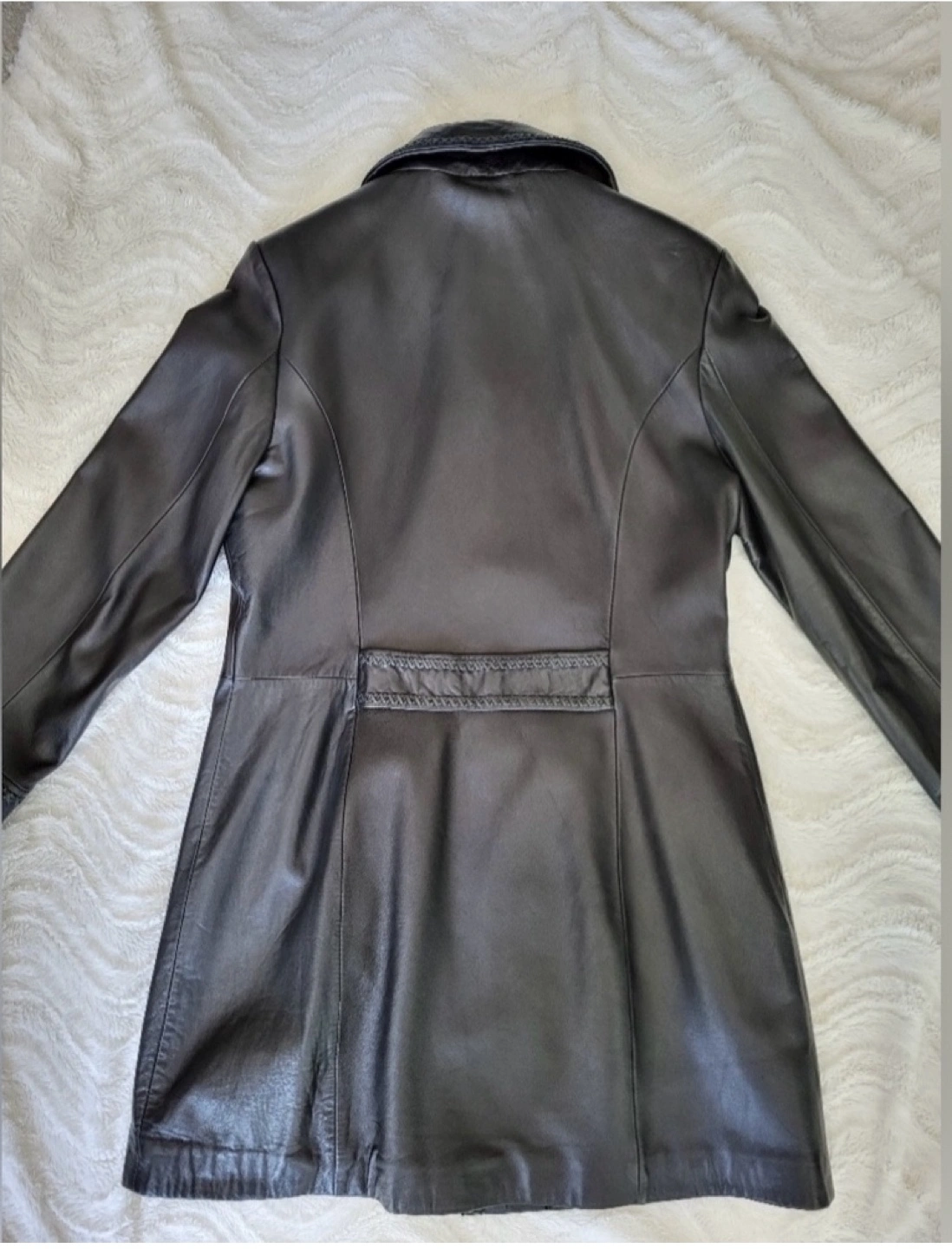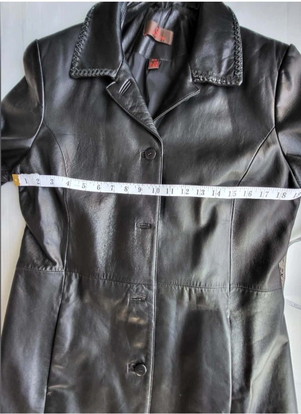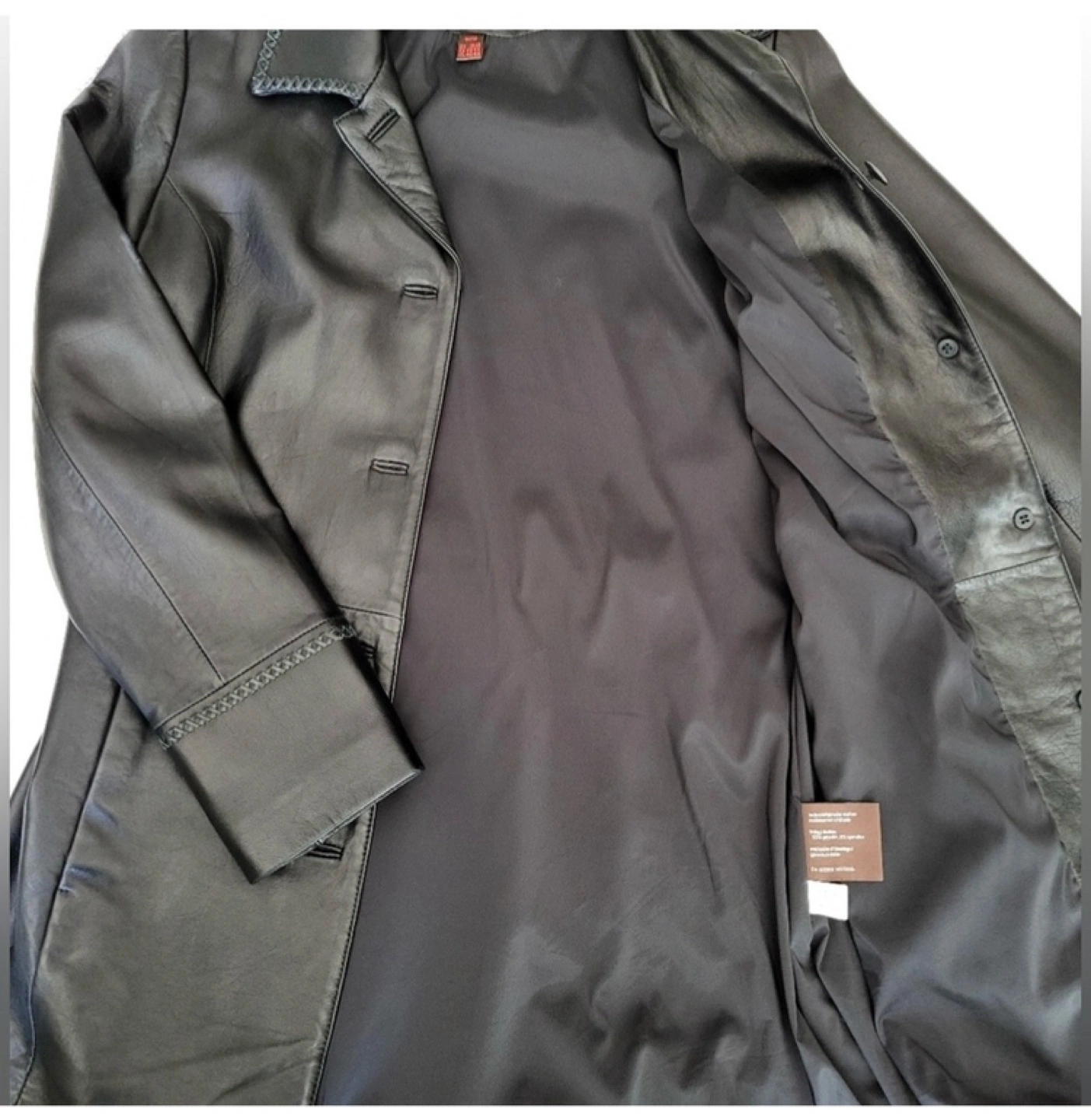 5NWOT Buttery soft women’s black leather coat, long, trench. Never worn, excellent condition Vintage Medium, UK 16-18 CAD size 14 cash only Just-below-the-knee length Front concealed pockets Fully lined Attached back belt Length from top of collar to the hem at the back approx 37 inches Back shoulder seam to shoulder seam approx 18 inches Single-breasted button front opening Classic lines, classic look, timeless Smoke-free and pet-free environment High quality leather, button-up trench Fall, Winter, Spring, business, office, casual outerwear, dressy, formal.