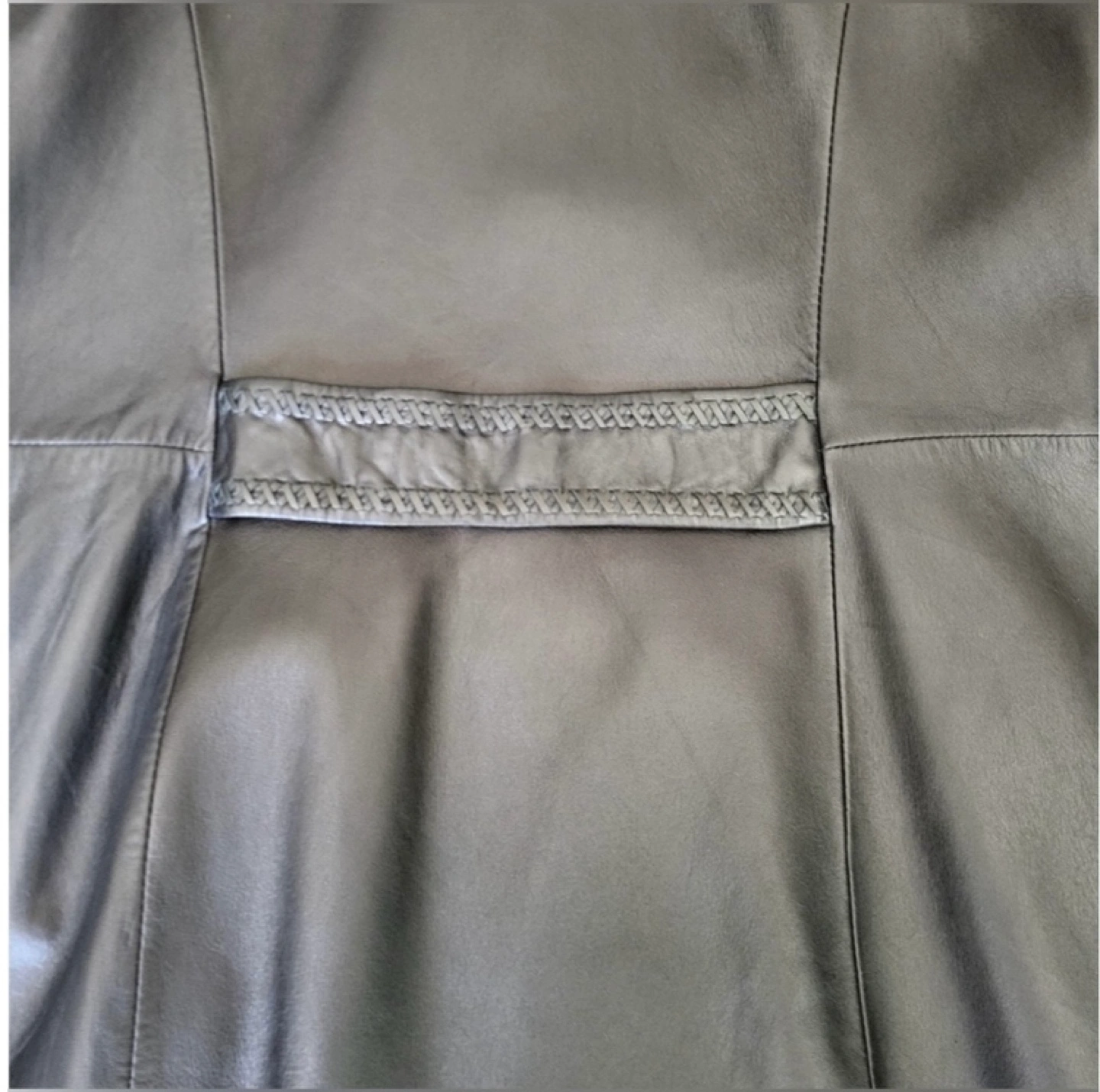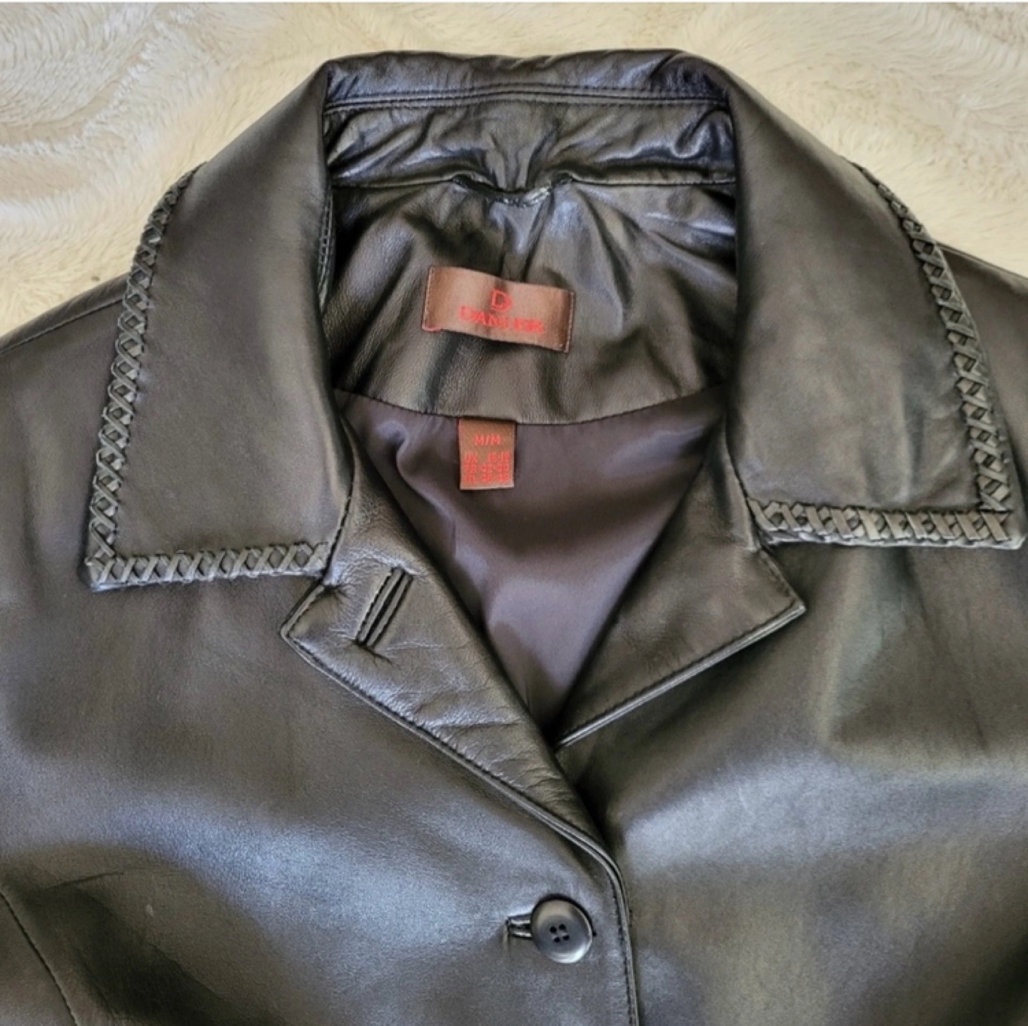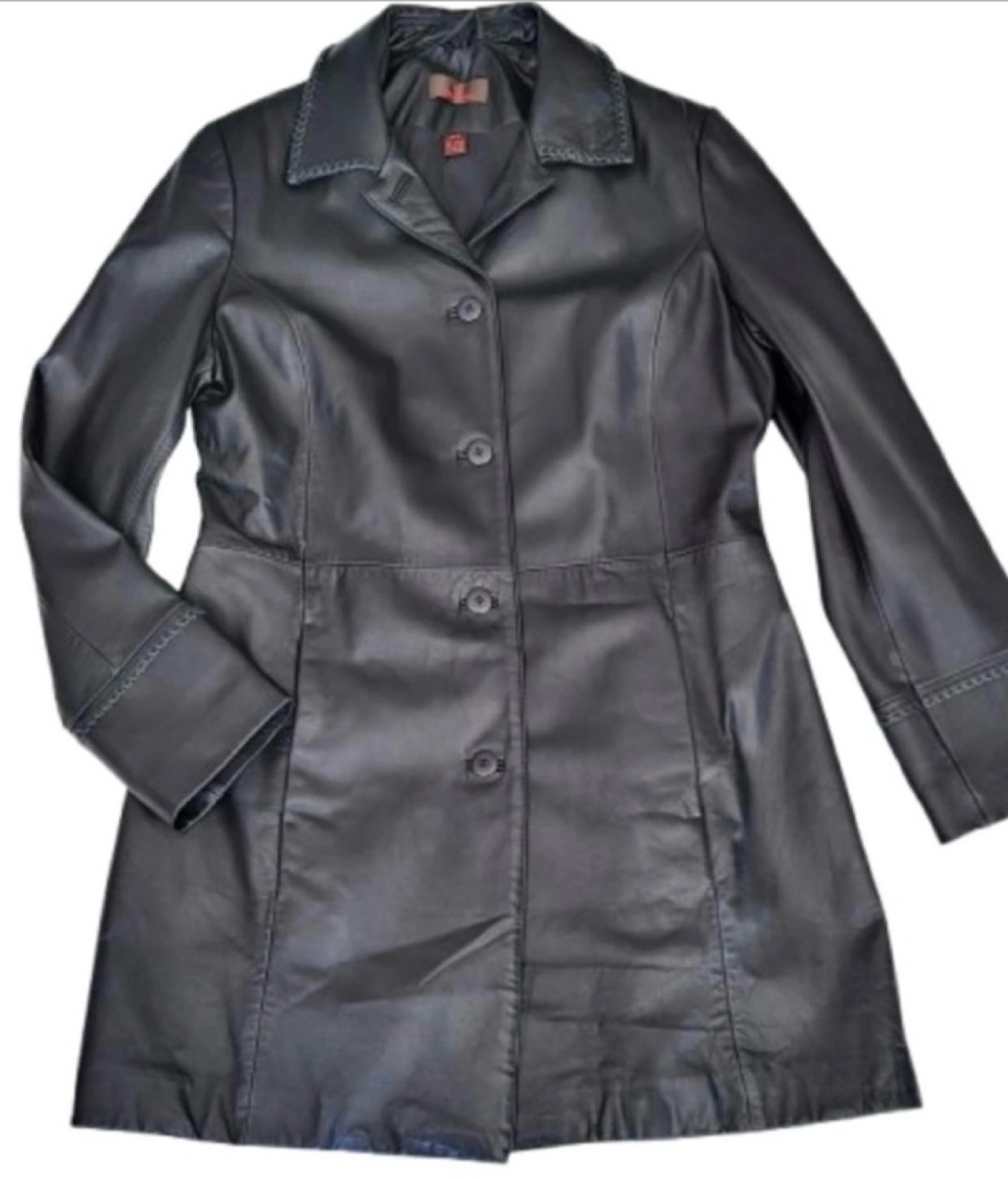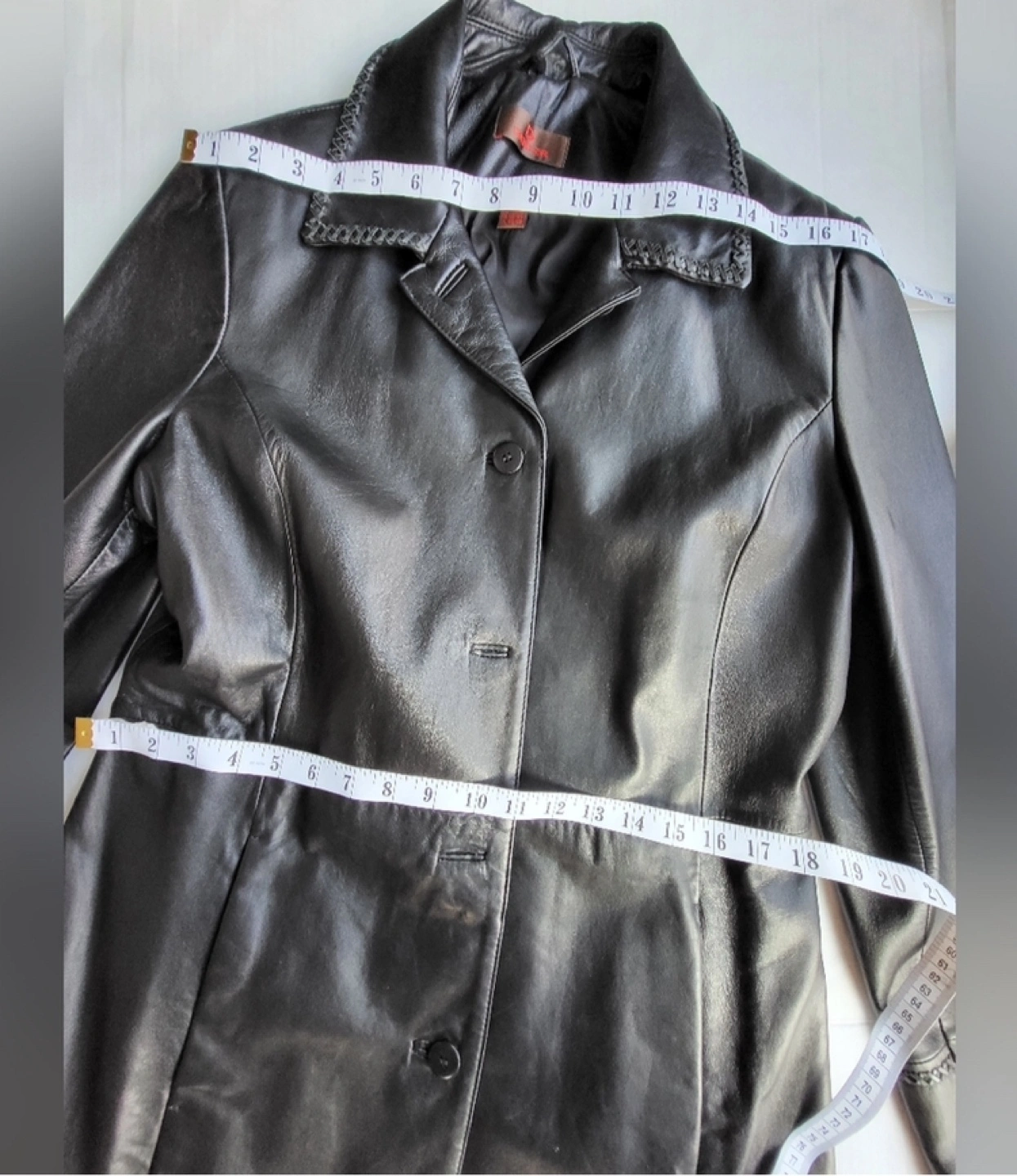 5NWOT Buttery soft women’s black leather coat, long, trench. Never worn, excellent condition Vintage Medium, UK 16-18 CAD size 14 cash only Just-below-the-knee length Front concealed pockets Fully lined Attached back belt Length from top of collar to the hem at the back approx 37 inches Back shoulder seam to shoulder seam approx 18 inches Single-breasted button front opening Classic lines, classic look, timeless Smoke-free and pet-free environment High quality leather, button-up trench Fall, Winter, Spring, business, office, casual outerwear, dressy, formal.