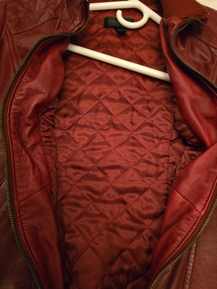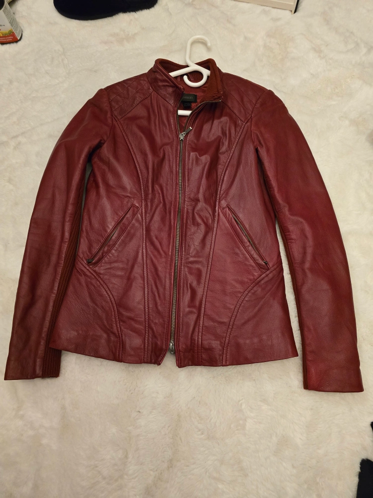 160Gorgeous burgundy leather jacket. Zip front closure. Fully lined. Ribbed knit cuffs. Multiple pockets. Excellent condition.