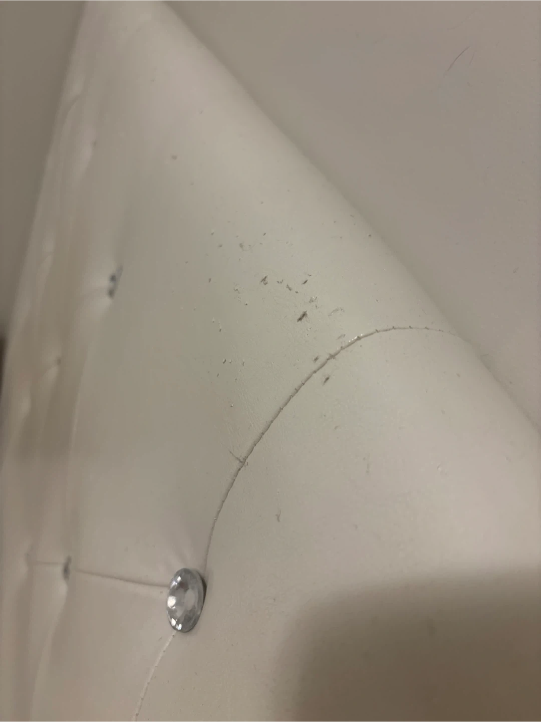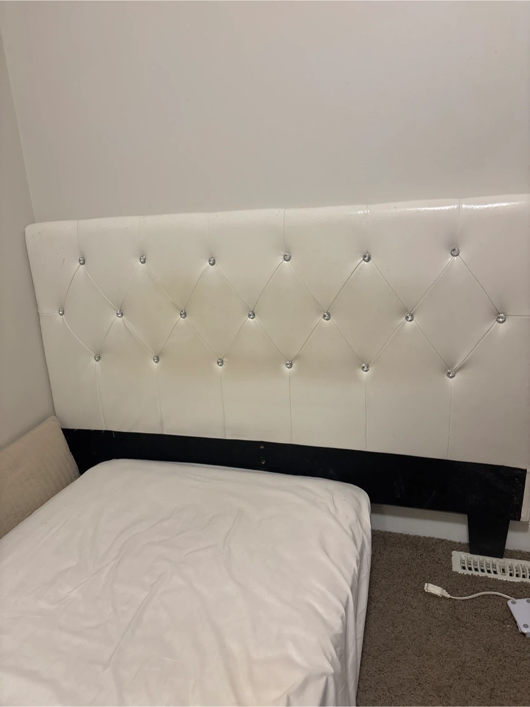 White tufted headboard with rhinestones. Faux leather material and diamond-stitched pattern.