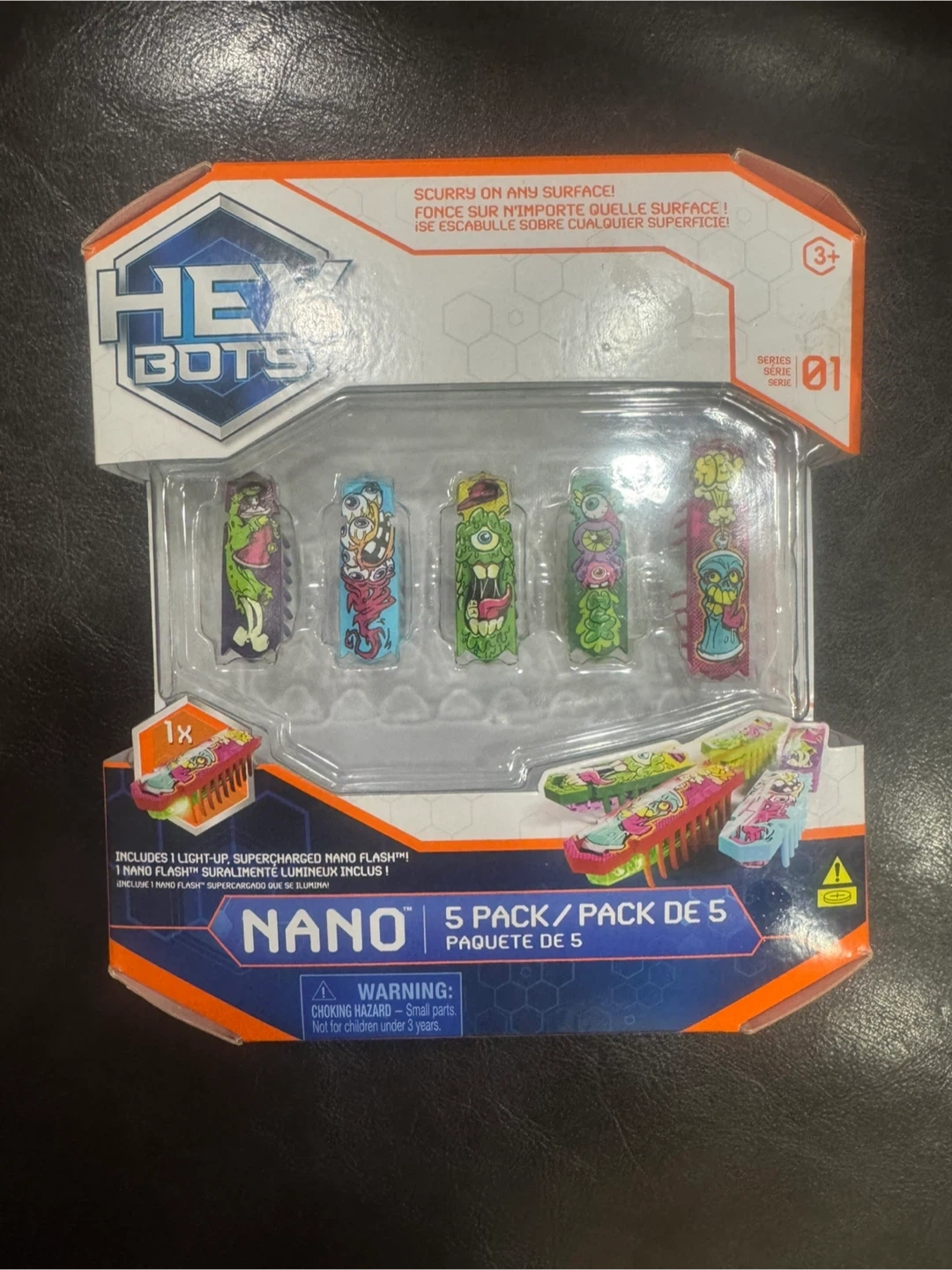 Expand your nano universe with this 5-pack! These nanos scurry, flip, and bounce. Powered by vibration technology, they're designed for nonstop exploration. This set includes 4 Nano and 1 Flash Nano. 6 LR44 batteries are included. For ages 3+.