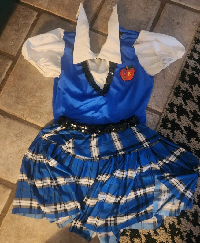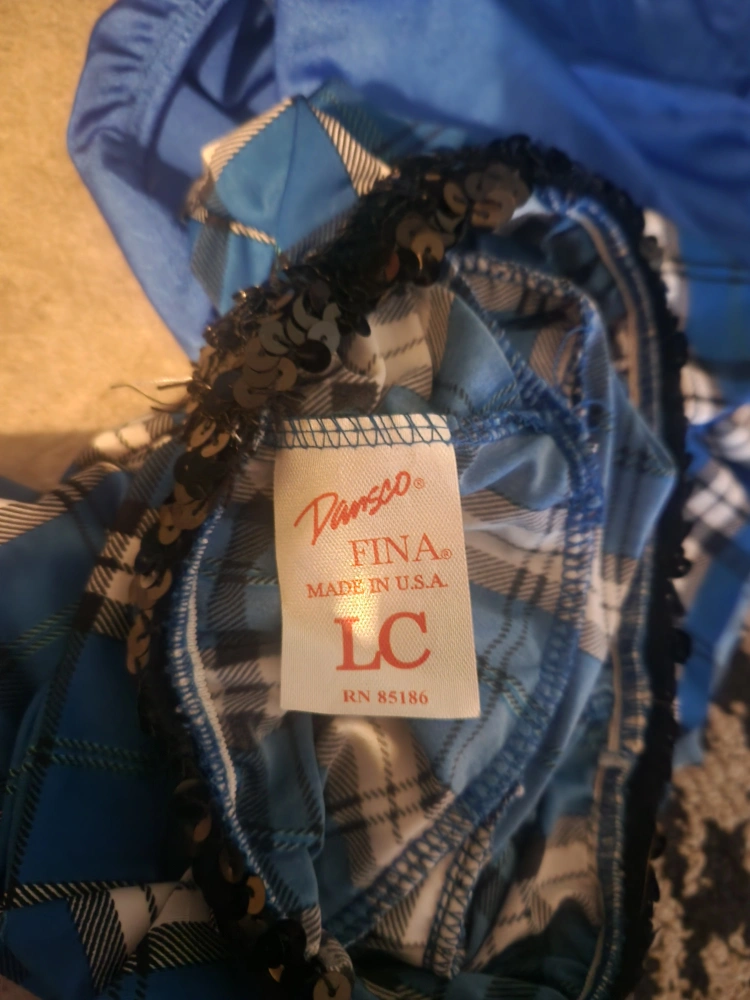 Selling a Dansco dance costume in size LC. It features a blue and white plaid skirt with a blue top. Perfect for dance performances or dress-up!