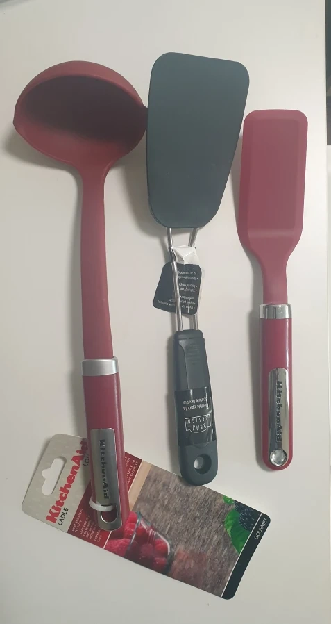 New unused red Kitchenaid spatula and laddle, and a new unused no brand black spatula.