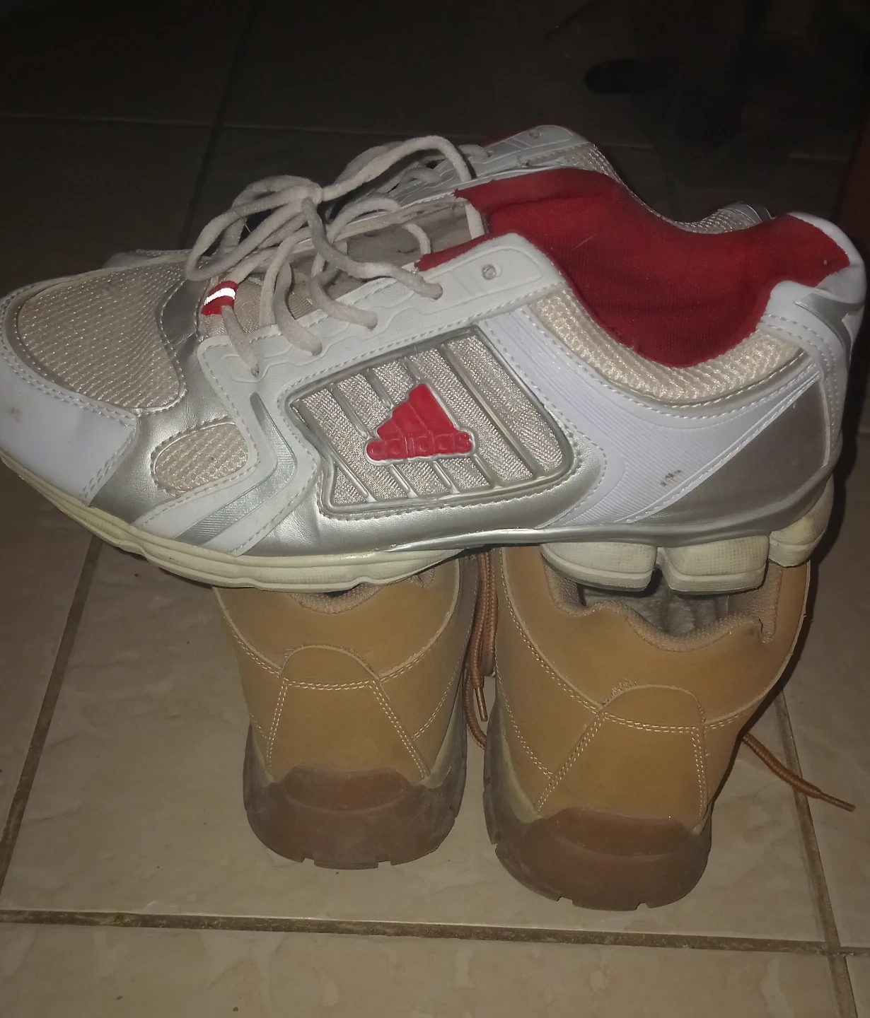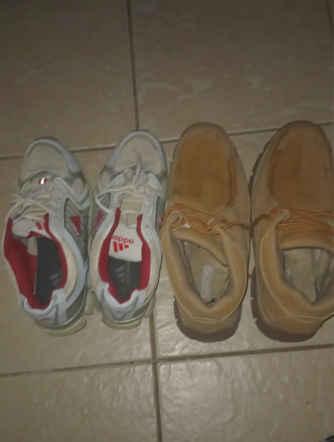 Selling both pair of Adidas running shoes in white and red, and a pair of tan moccasin-style boots with faux fur lining. Both pairs are pre-owned. All 4 for $35. I'm open to offers. These shoes needs a TLC. Need it gone.