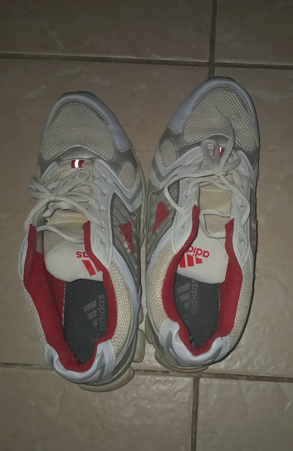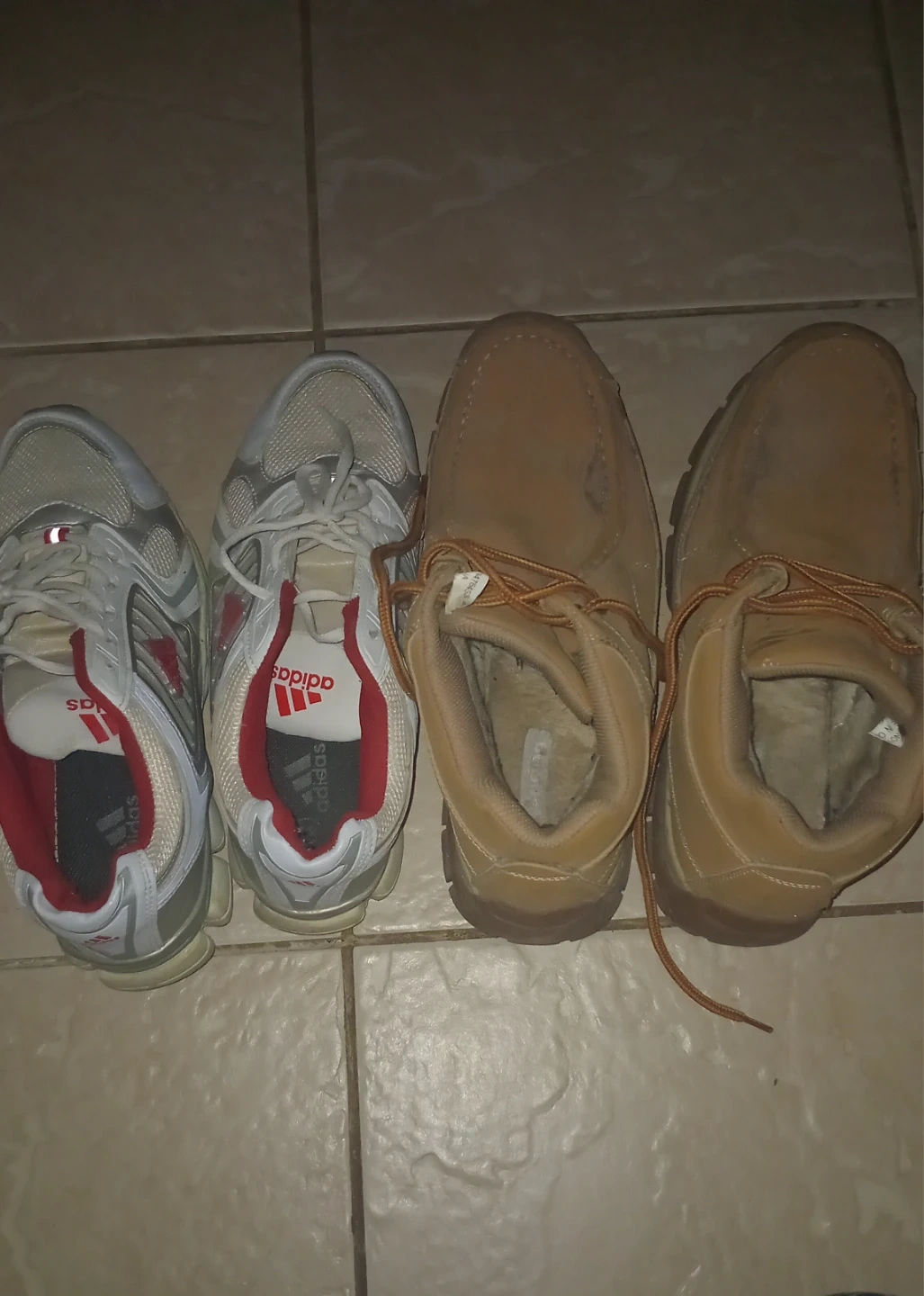Selling both pair of Adidas running shoes in white and red, and a pair of tan moccasin-style boots with faux fur lining. Both pairs are pre-owned. All 4 for $35. I'm open to offers. These shoes needs a TLC. Need it gone.