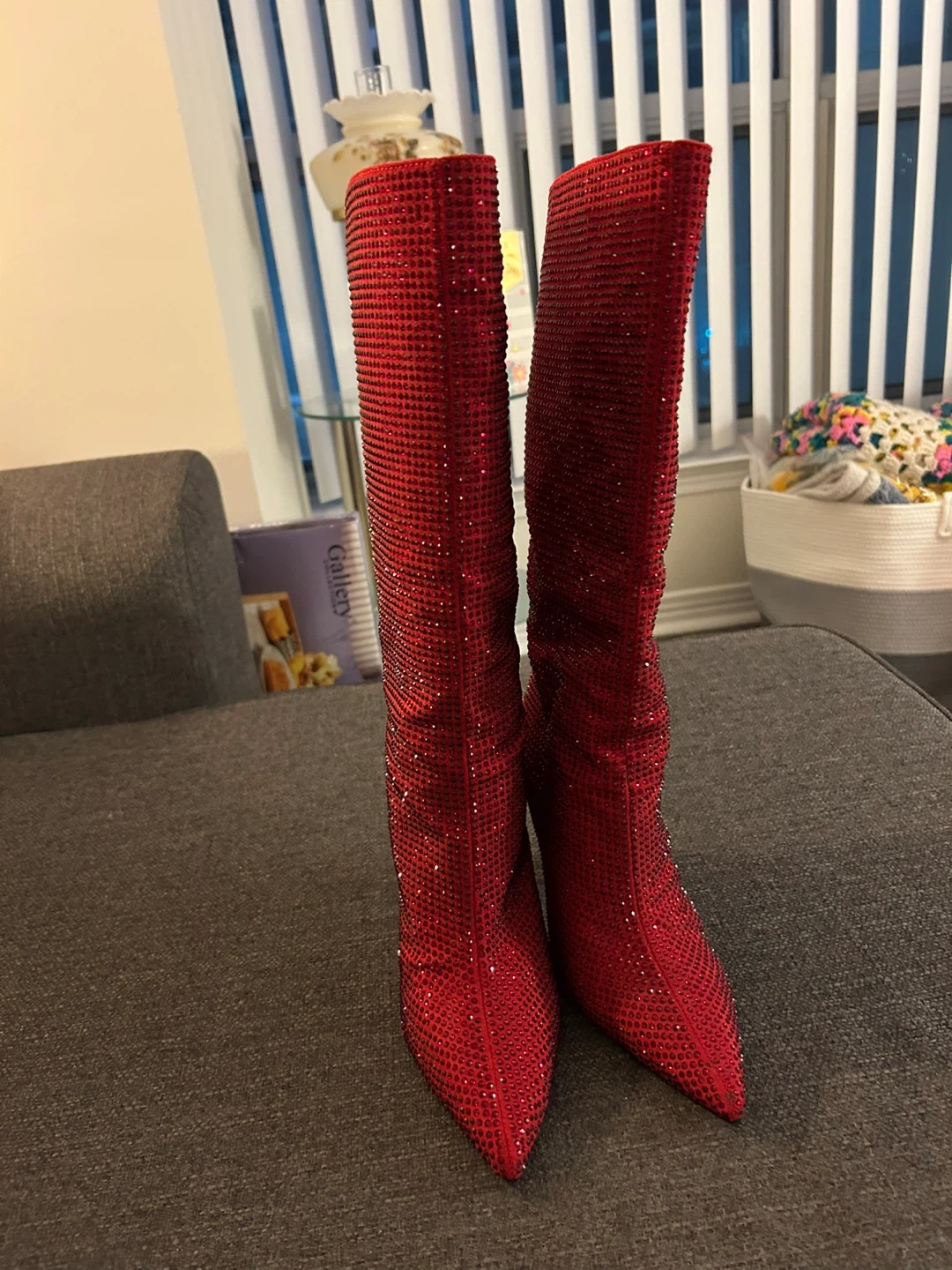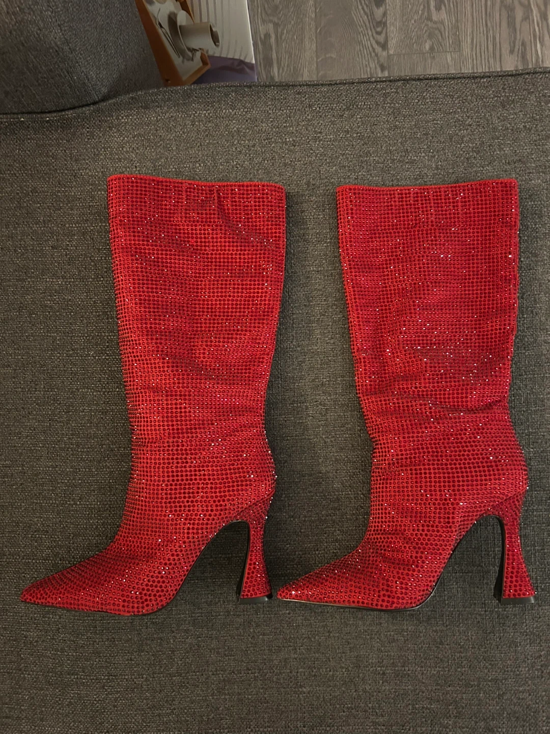 Aldo mid-calf dress boots embellished with red shiny, shimmery rhinestones.