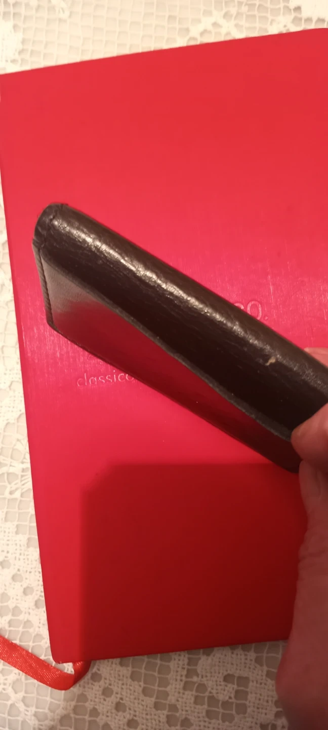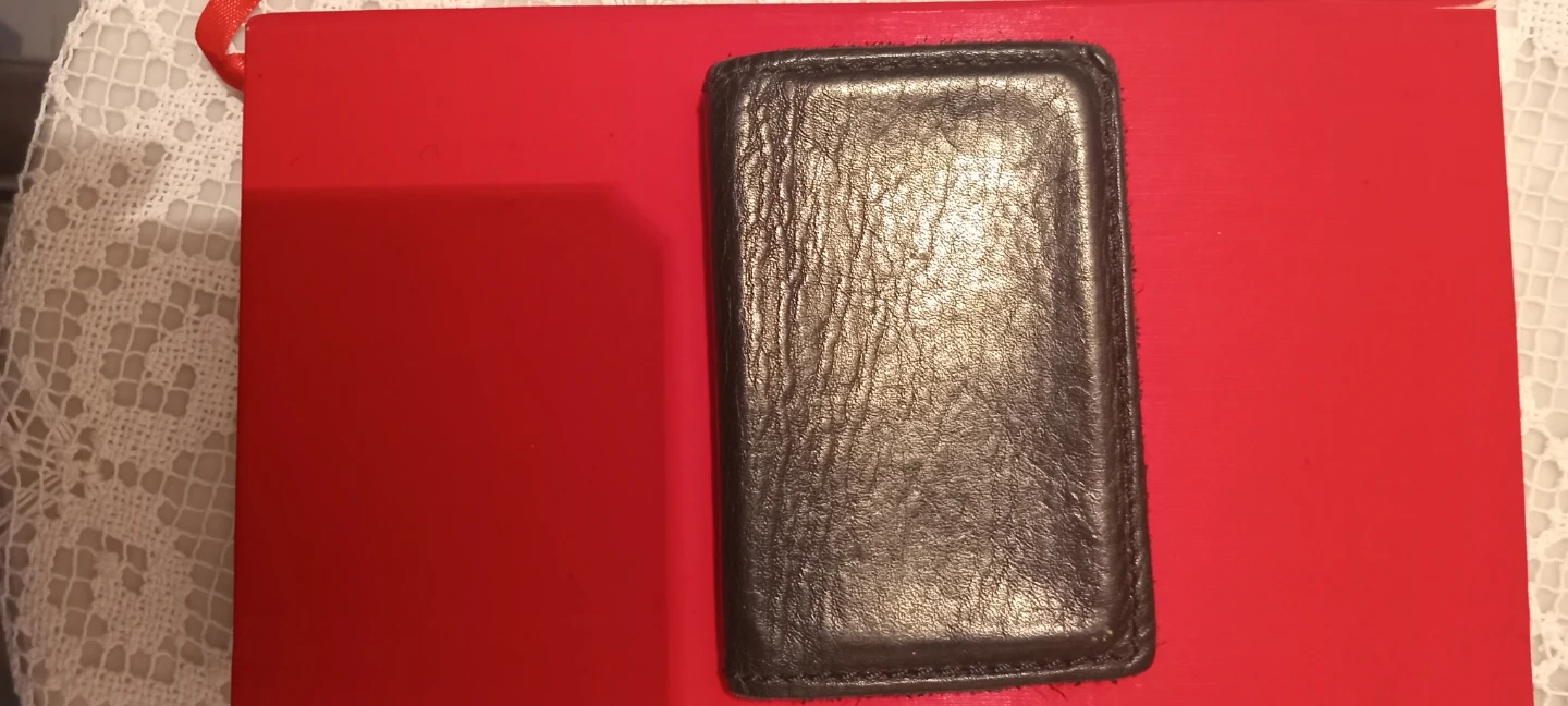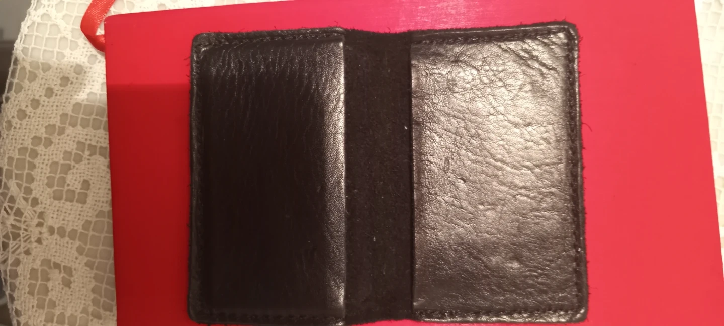 This is a black leather card holder. It's made of genuine leather. The holder has multiple slots for your cards. Still lots of wear to go. Great condition