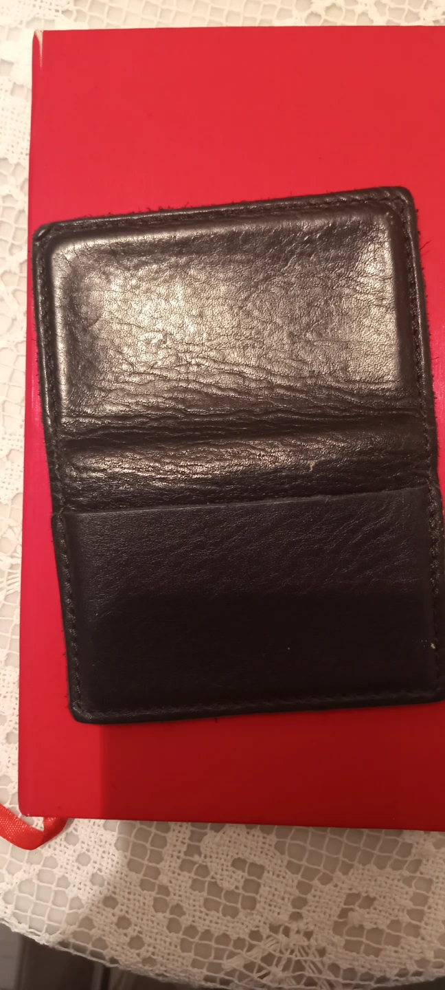 This is a black leather card holder. It's made of genuine leather. The holder has multiple slots for your cards. Still lots of wear to go. Great condition