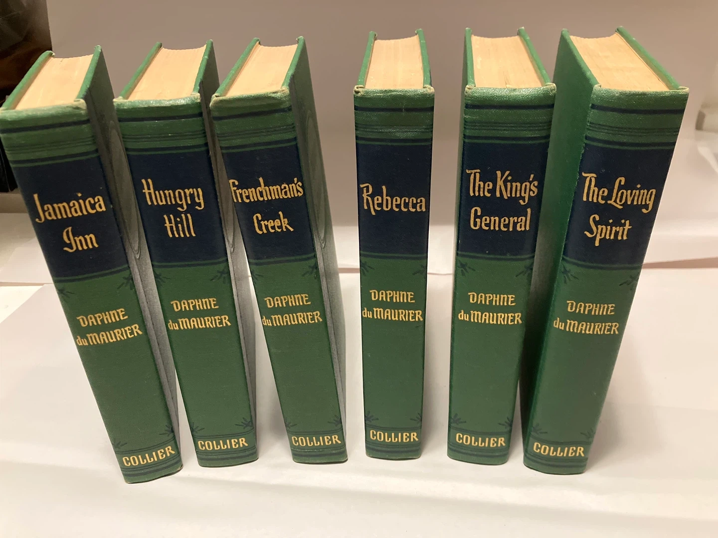 Selling a set of books by Daphne du Maurier, published by Collier. Titles include Jamaica Inn, Hungry Hill, Frenchman's Creek, Rebecca, The King's General, and The Loving Spirit. Perfect for a fan of classic literature! Hardcover with no markings inside.