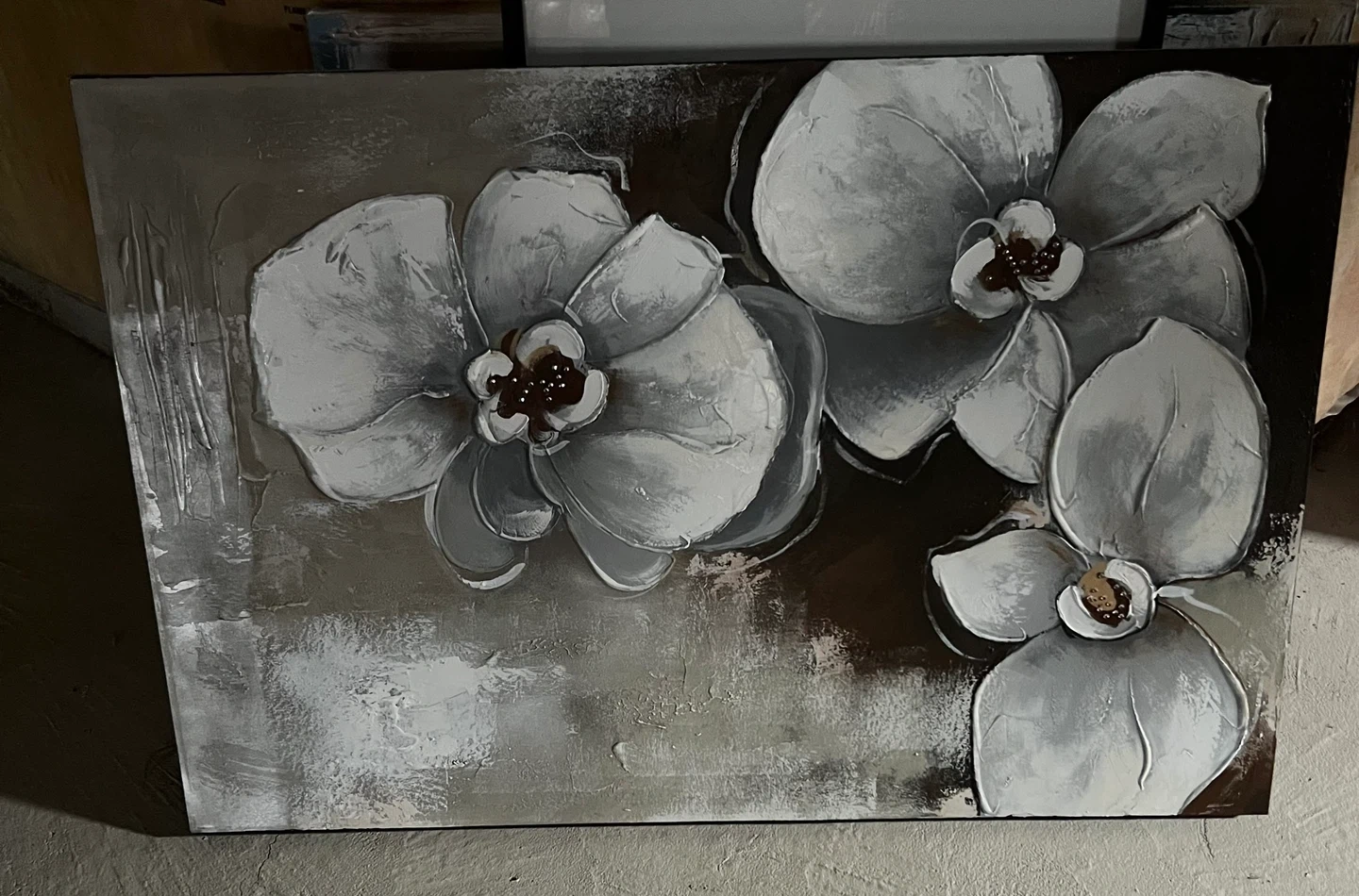 This textured wall art features a beautiful floral design with raised petals and a distressed background. It's a great piece to add a touch of elegance to any room. The dimensions are approximately 48”x 32”