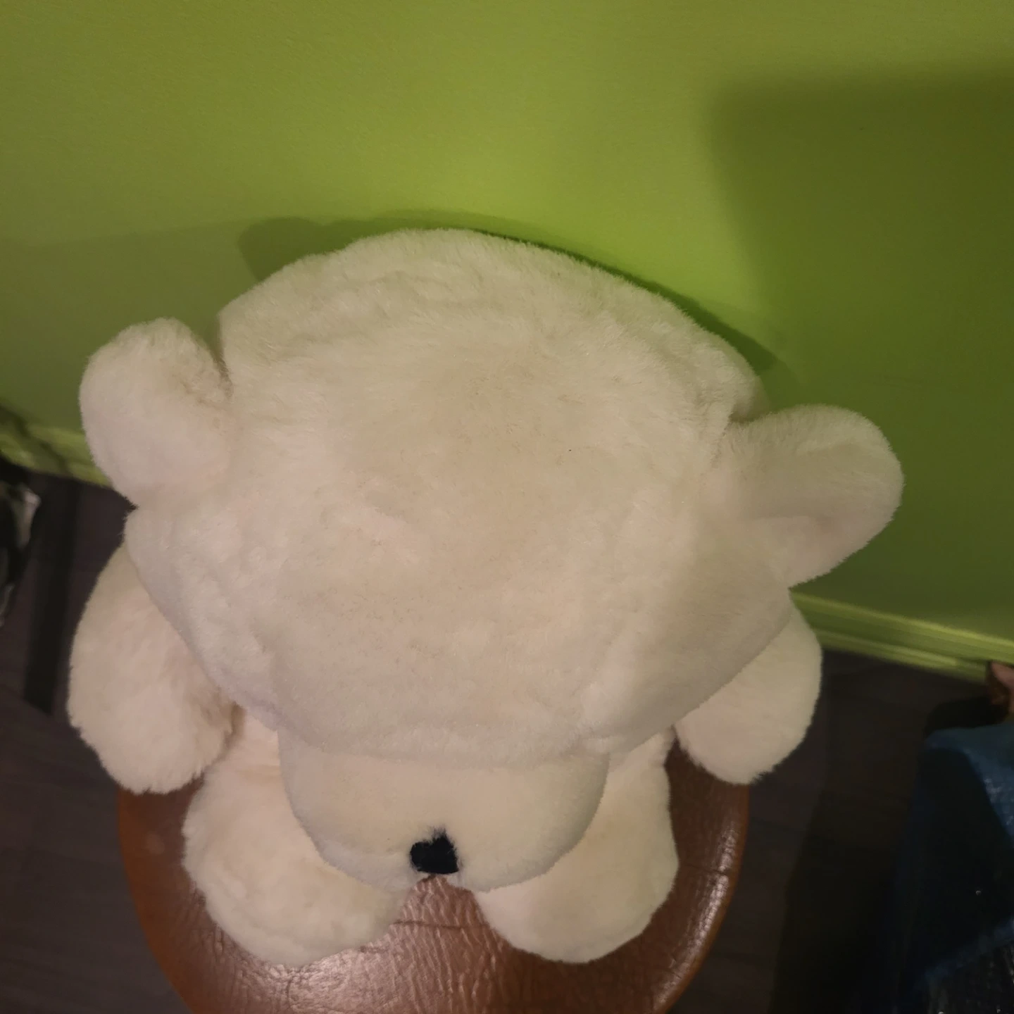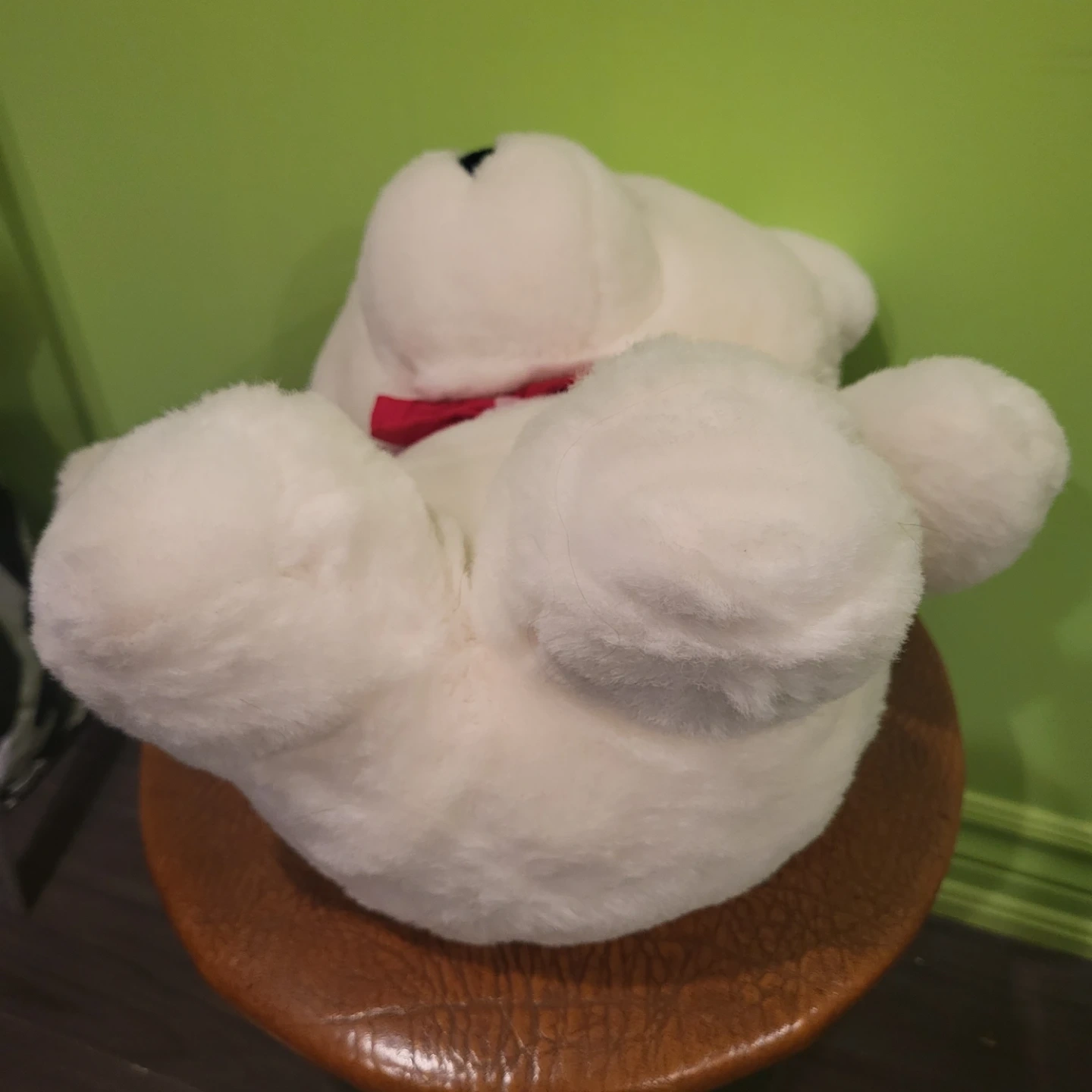 This is a soft, white teddy bear plush toy. It's approximately 12 inches tall and wears a red bow tie. Its fur is fluffy and its eyes and nose are black.