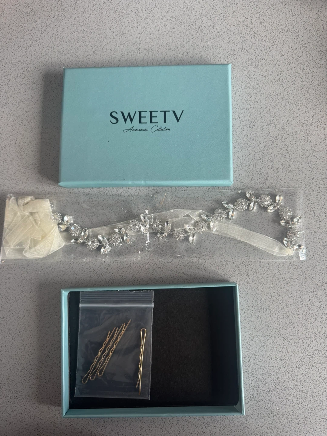 Selling a flower girl crystal headband. Includes the original box and hair pins! Brand new, never used